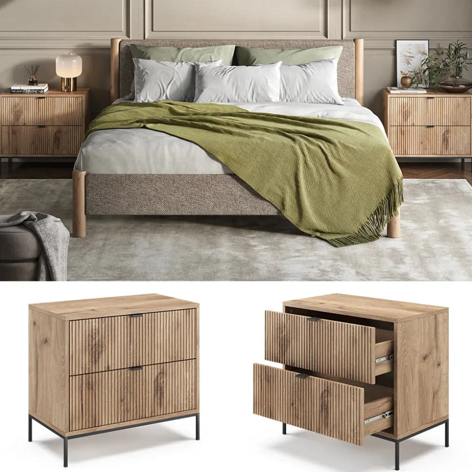 Das Nachtschränke – 2er Set vereint stilvolles Design und praktische Funktionalität. Schaffen Sie eine symmetrische Atmosphäre in Ihrem Schlafzimmer. Die Schubladen bieten viel Stauraum für persönliche Gegenstände und schaffen Ordnung im Schlafzimmer. Die pflegeleichte Oberfläche ermöglicht Ihnen eine einfache Reinigung und langanhaltende Schönheit. Die Nachttische lassen sich perfekt mit anderen Möbeln der Eliza-Serie kombinieren und sorgen für eine einheitliche und stilvolle Raumgestaltung.