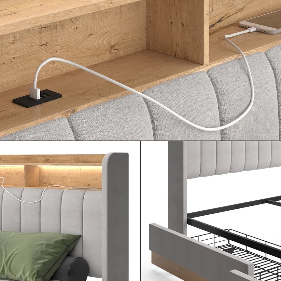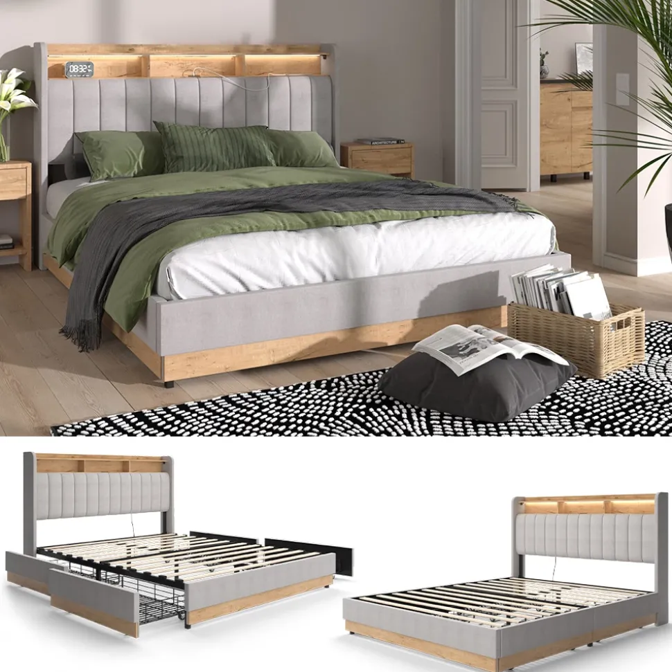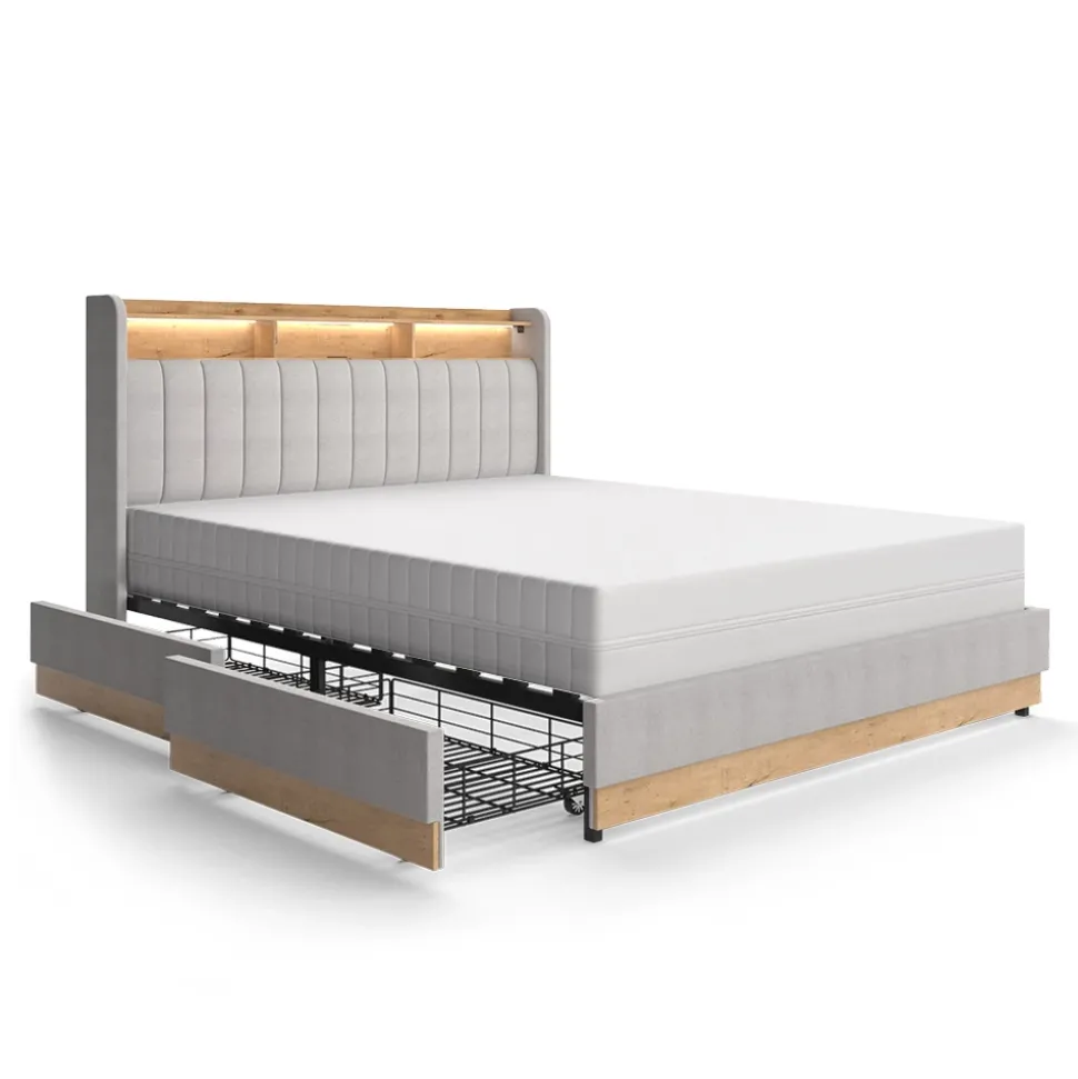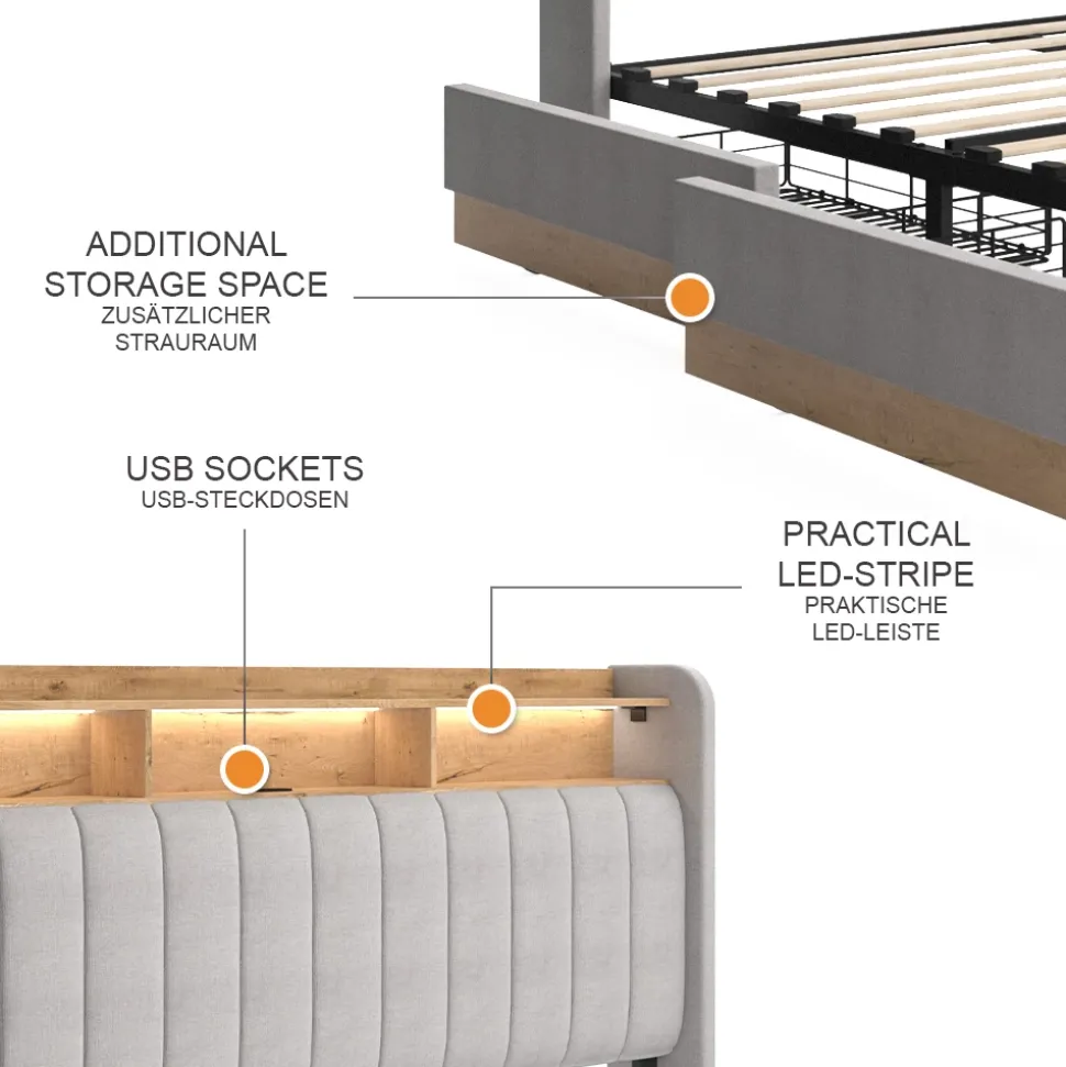- LIEFERUMFANG: 1x Bett, 1x USB Steckdose. 1x LED Streifen, 1x Fernbedienung , 4x Schubladen mit Metallgitter (Dekoration nicht enthalten)