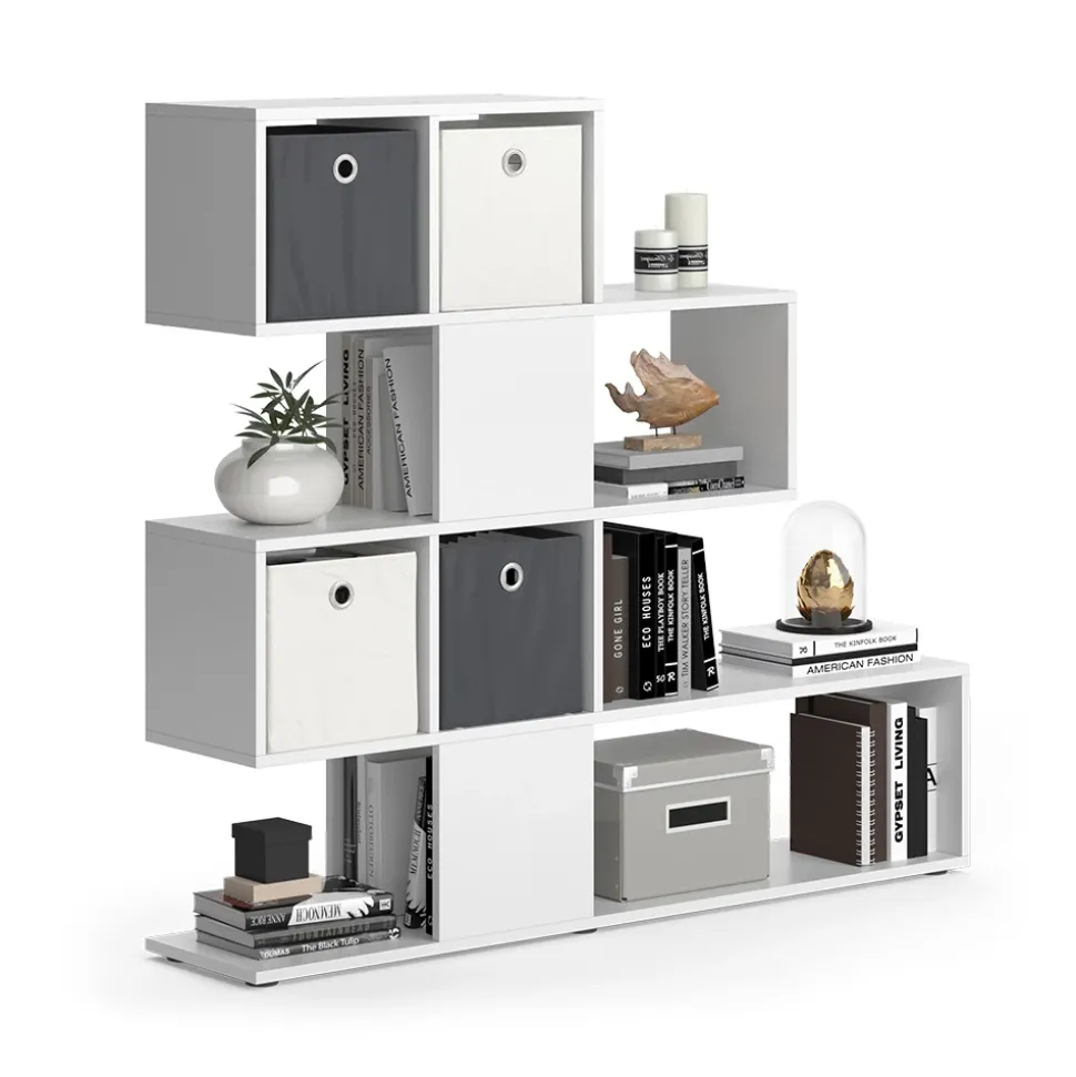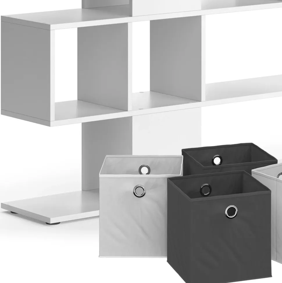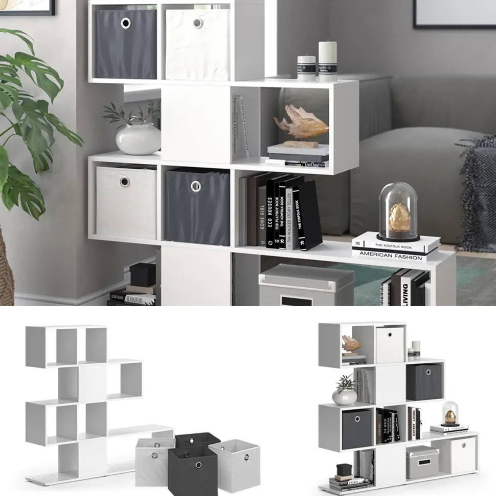 - Der Vicco Raumteiler Hylda ist ein stilvolles Standregal in Weiß mit 4 Faltboxen. Das Treppenregal stehend eignet sich perfekt als offener Raumteiler oder Bücherschrank im Wohnzimmer.