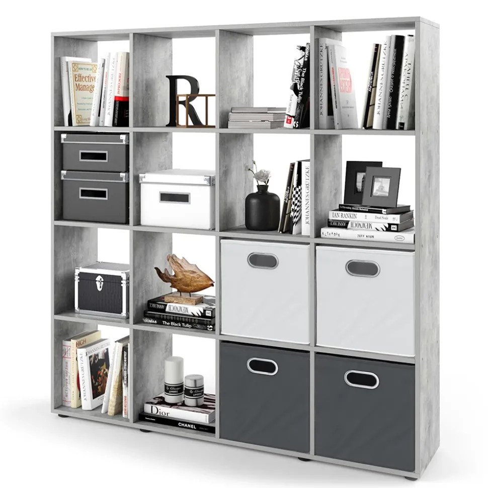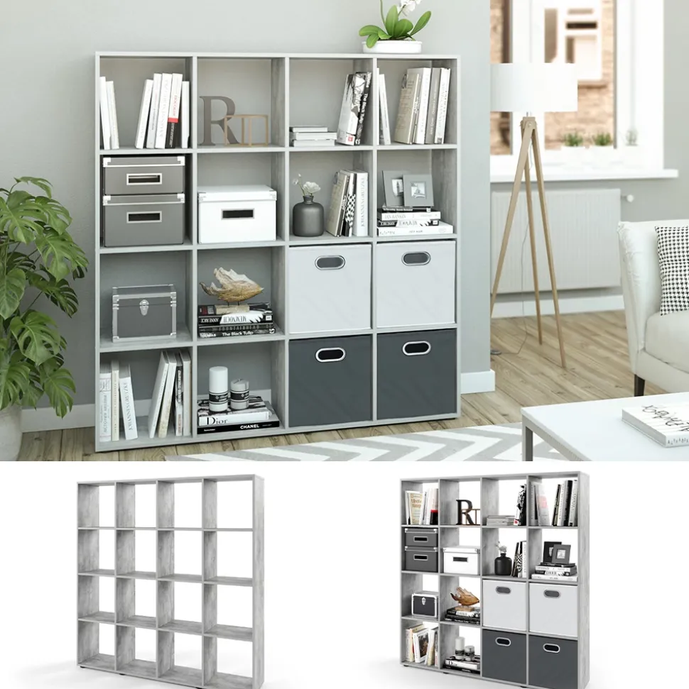 - Das stehende Bücherregal mit Karree-Design bietet 16 offene Ablagen und kann als Raumteiler genutzt werden. Die Regale sind perfekt für 30×30 Kartons geeignet.