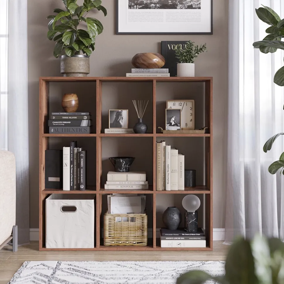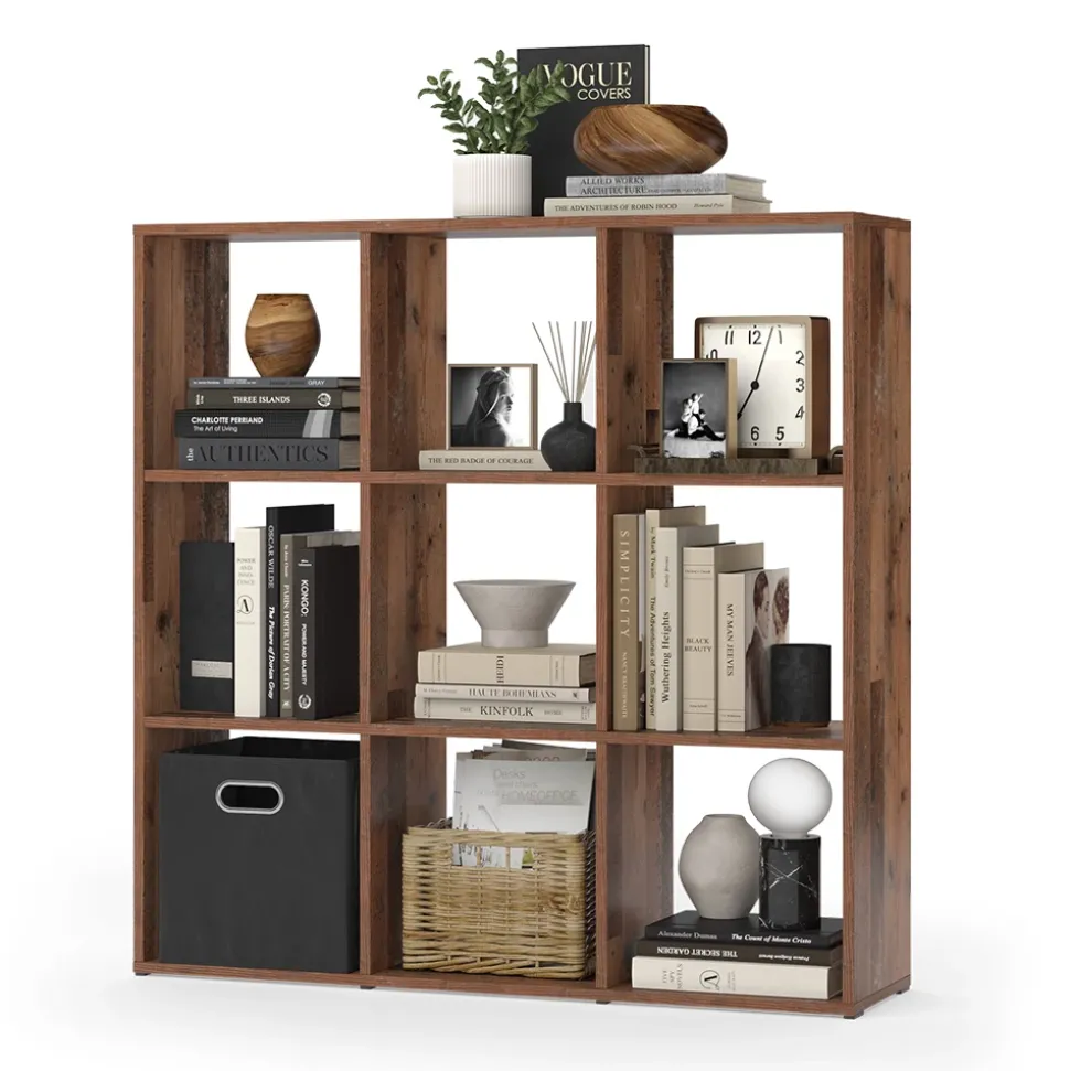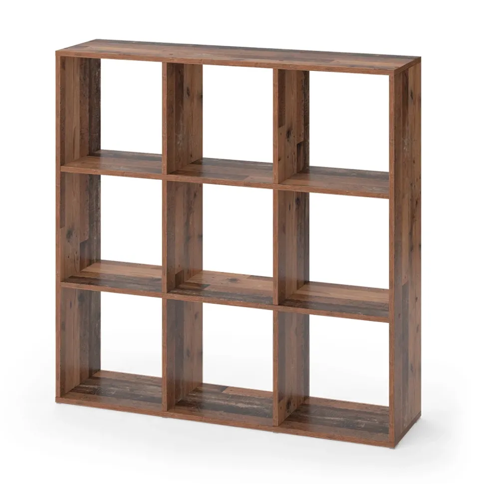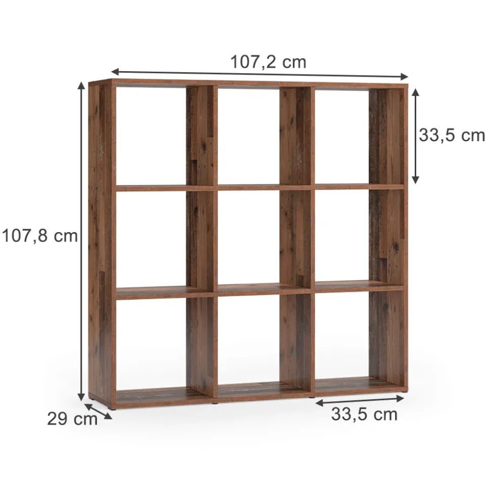 - Das stehende Bücherregal Regal bietet 9 offene Ablagen und Fächer für 30×30 Kartons. Es kann als Raumteiler verwendet werden.