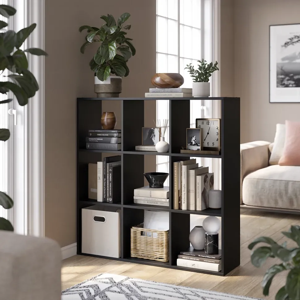 - Das stehende Bücherregal Regal bietet 9 offene Ablagen und Fächer für 30×30 Kartons. Es kann als Raumteiler verwendet werden.