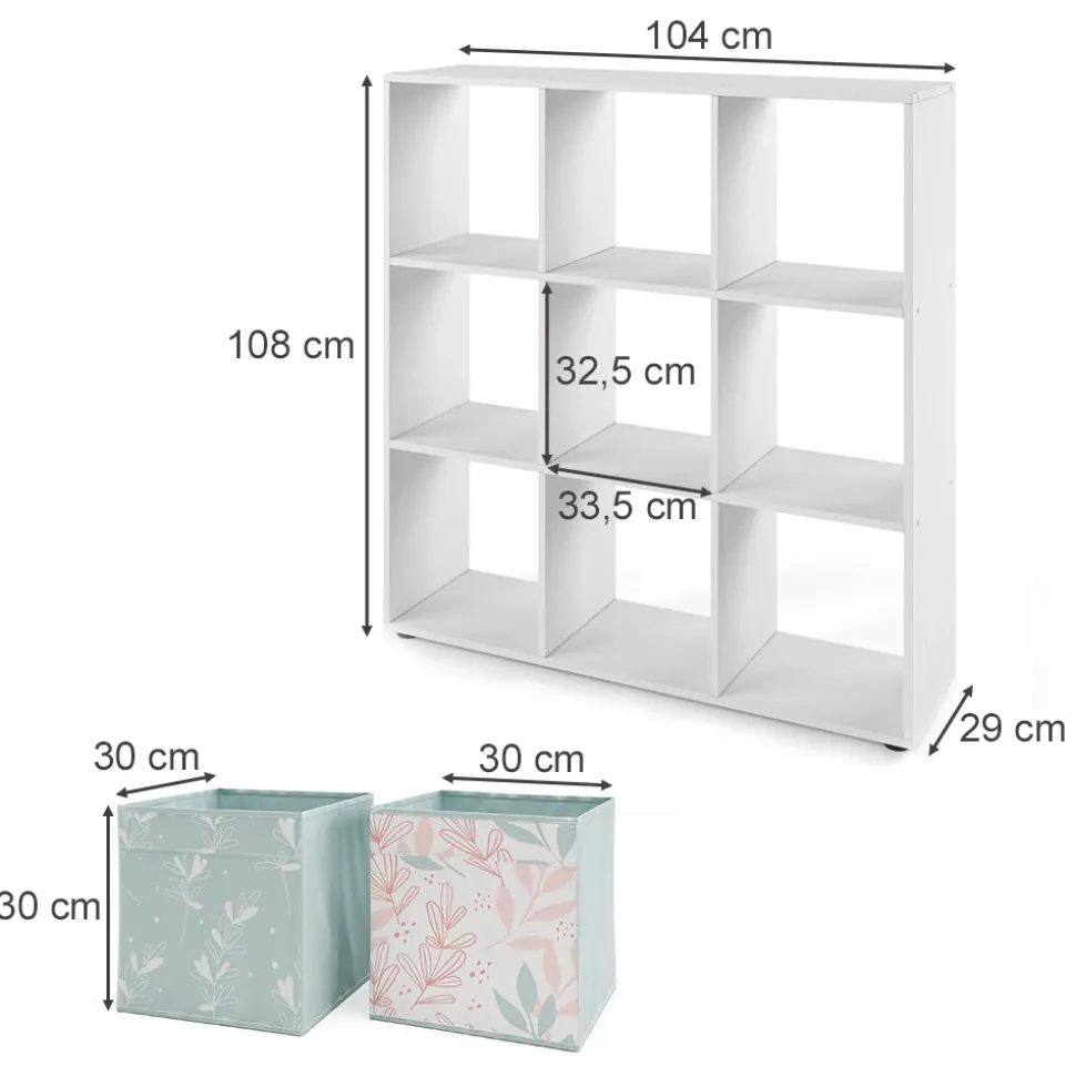 - Das stehende Bücherregal Regal bietet 9 offene Ablagen und Fächer für 30×30 Kartons. Es kann als Raumteiler verwendet werden.