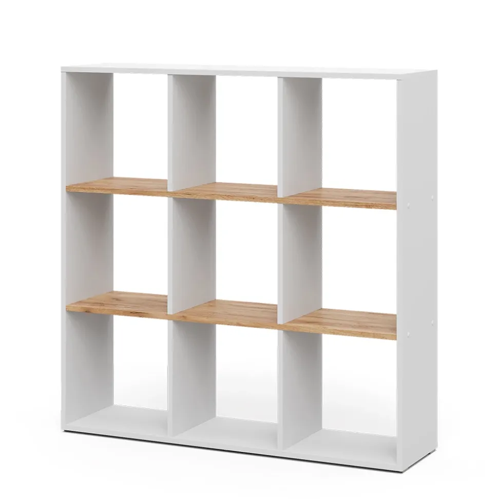 - Das stehende Bücherregal Regal bietet 9 offene Ablagen und Fächer für 30×30 Kartons. Es kann als Raumteiler verwendet werden.