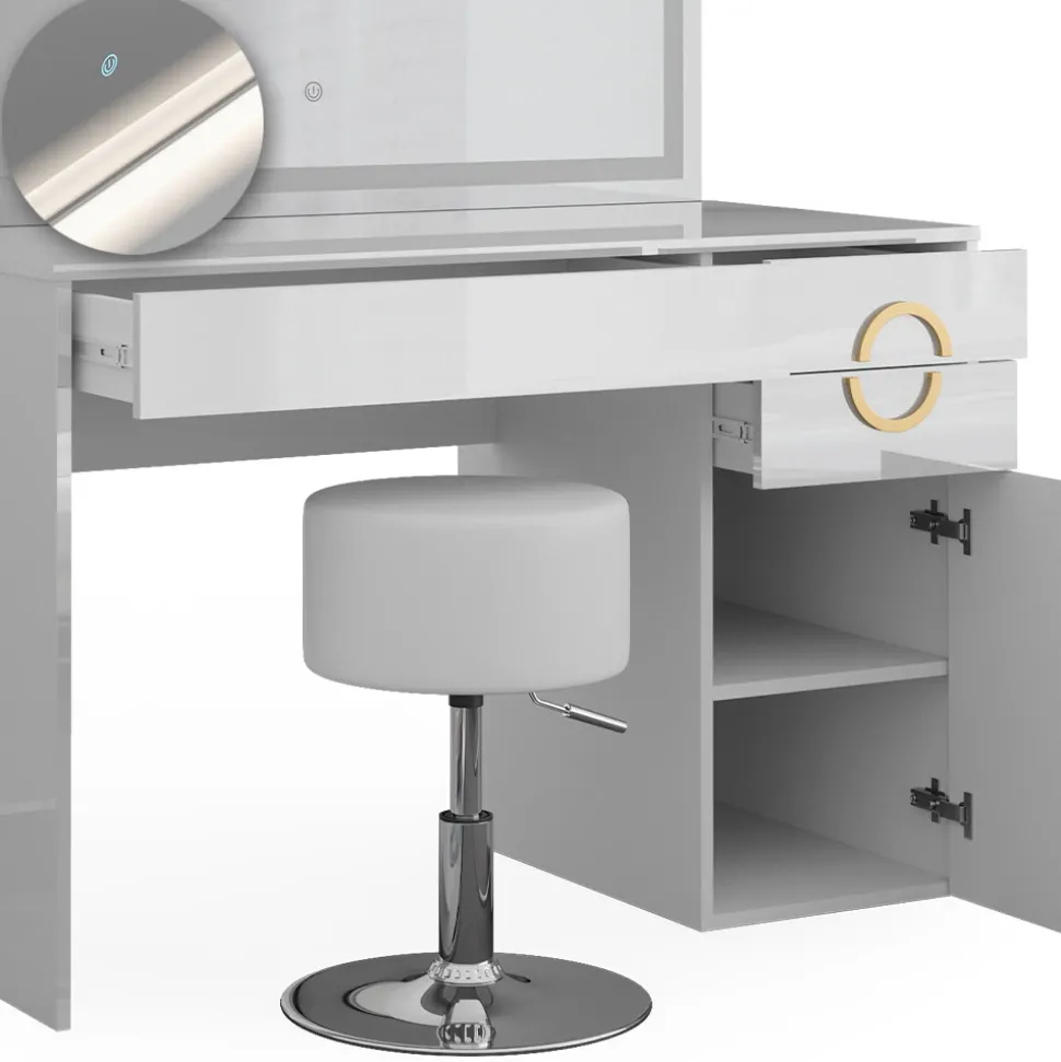 - Entdecken Sie den Vicco Schminktisch Adela im strahlenden Weiß Hochglanz mit LED-Spiegel und bequemem Hocker. Ihr perfekter Begleiter für Make-Up und Styling. Mit praktischer Schublade.