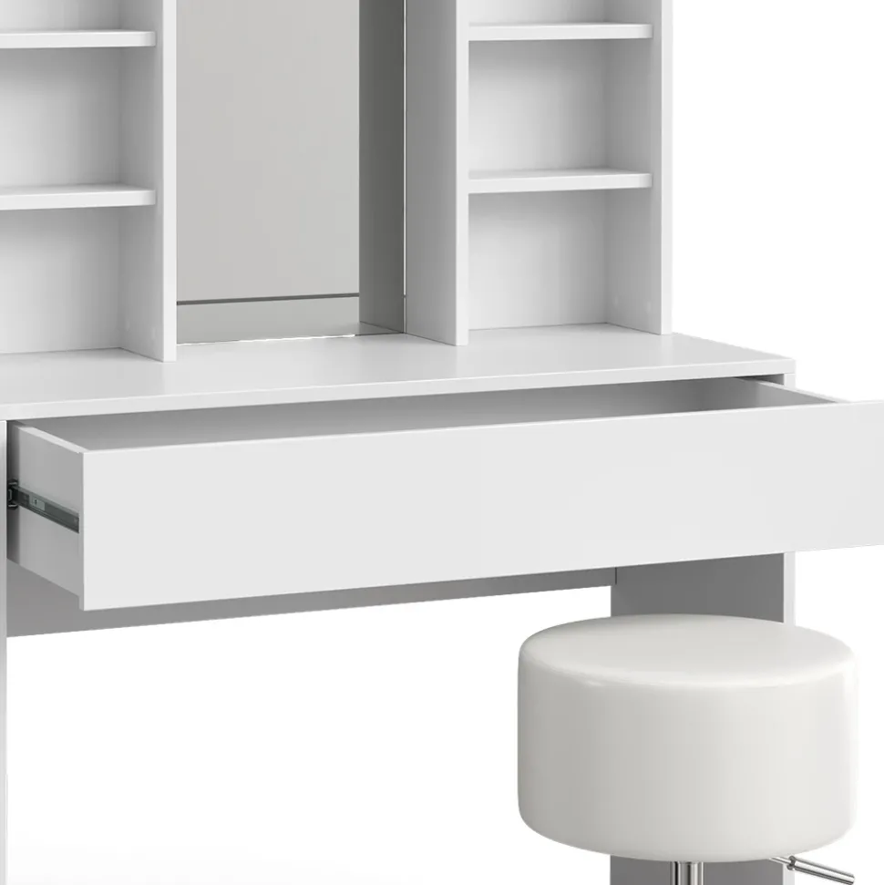 - MATERIAL: Unser Kosmetiktisch besteht aus 16 mm Spanplatte. Der Hocker hat ein Gestell aus verchromtem Stahl und einen Sitzbezug aus pflegeleichtem Kunstleder