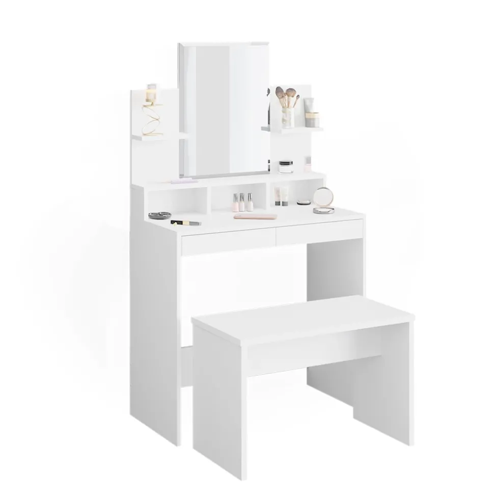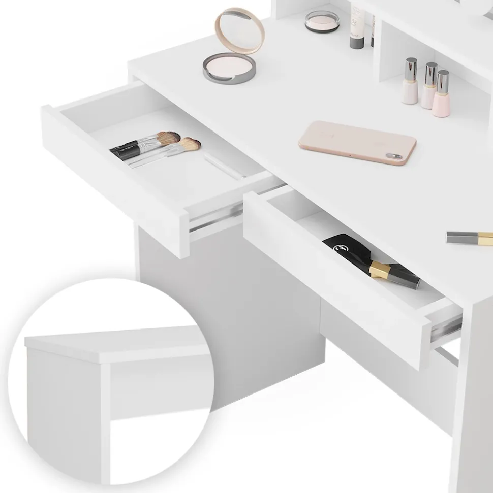 - Der Kosmetiktisch mit Spiegel bietet zahlreiche offene Ablagen und zwei geschlossene Schubladen für eine übersichtliche Aufbewahrung von Make-up und Accessoires.