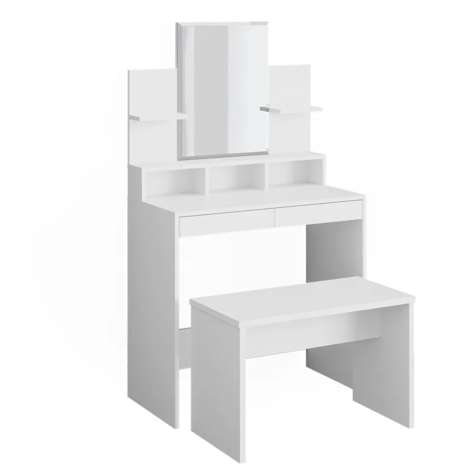 Der Schminktisch Ania mit Bank ist der perfekte Begleiter für alle Schminkliebhaberinnen! Der skandinavische Stil verleiht jedem Raum eine moderne Atmosphäre und lädt zum gemütlichen Styling ein. Mit seinen verschiedenen offenen Fächern und zwei geschlossenen Schubladen bietet er viel Stauraum für all Ihre Kosmetikprodukte und Schmuck. Der große rechteckige Spiegel lässt Sie Ihr perfektes Make-up spielerisch leicht kreieren und setzt ein Highlight in jedem Raum. Die Ania ist in verschiedenen Ausführungen erhältlich und passt sich somit Ihrem individuellen Stil perfekt an. Holen Sie sich den Schminktisch Ania mit Bank und erleben Sie ein einzigartiges Schminkerlebnis voller Charme und Eleganz!