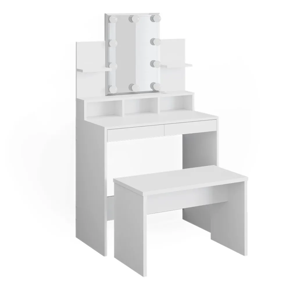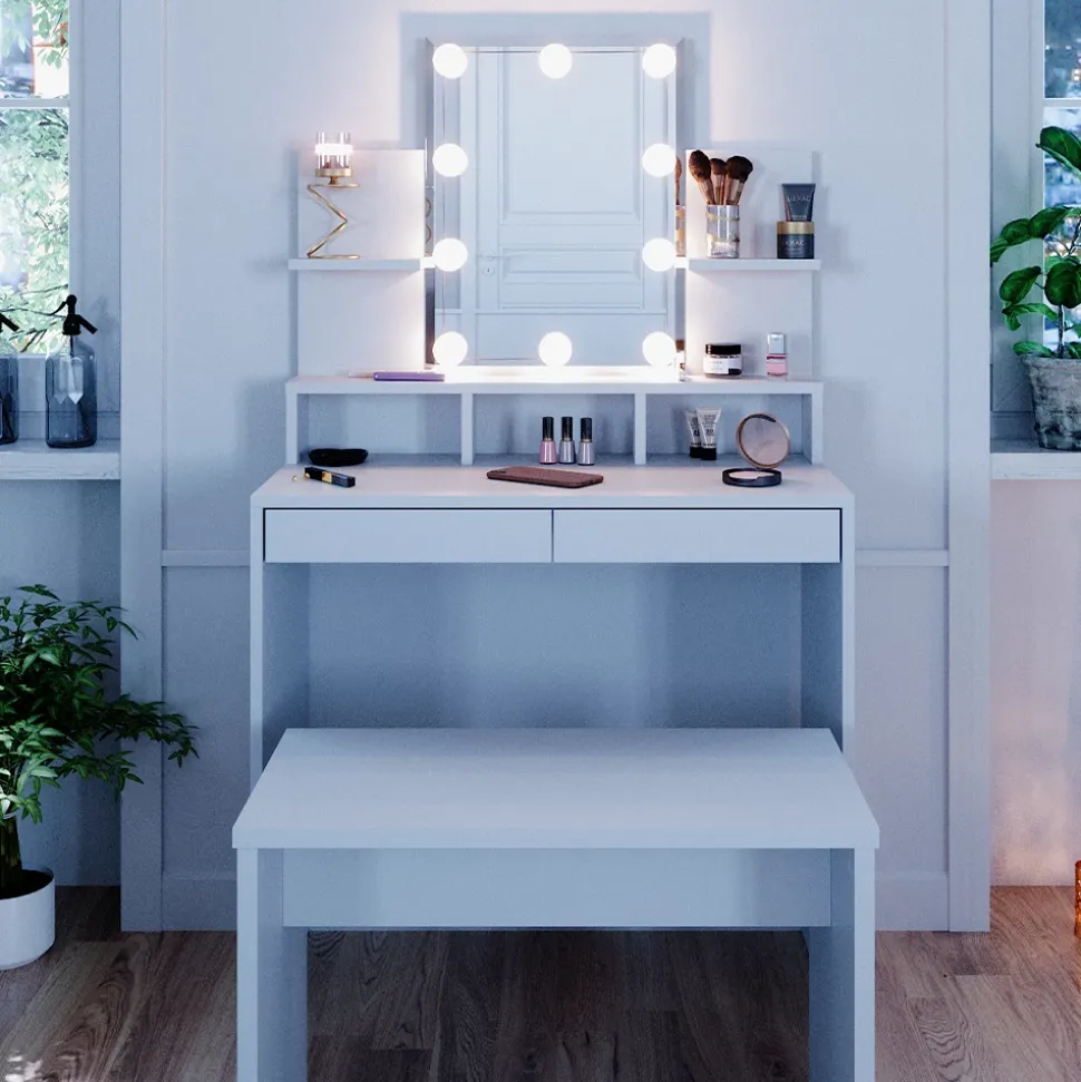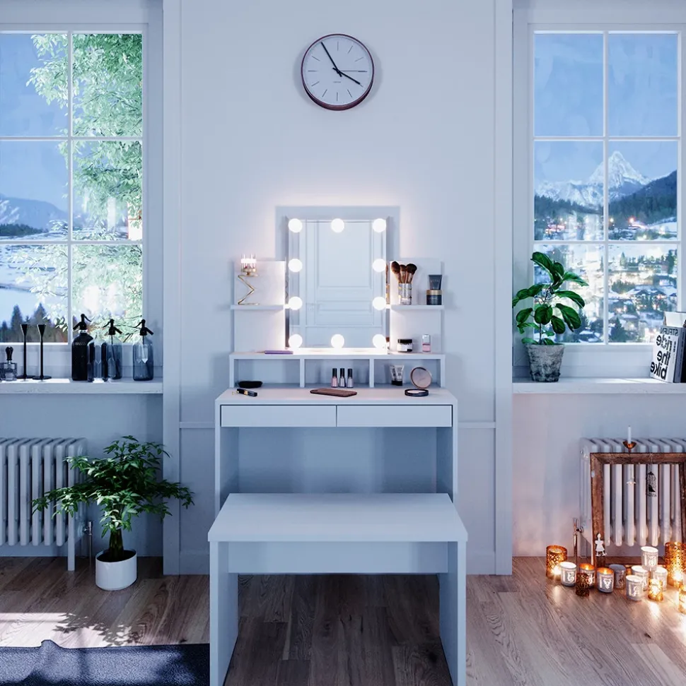 - Unsere gute Entscheidung für alle, die ein optimales Design suchen: Die Frisierkommode mit Beleuchtung und Hocker „Ania“. Universell einsetzbar und eine Freude in der Benutzung.