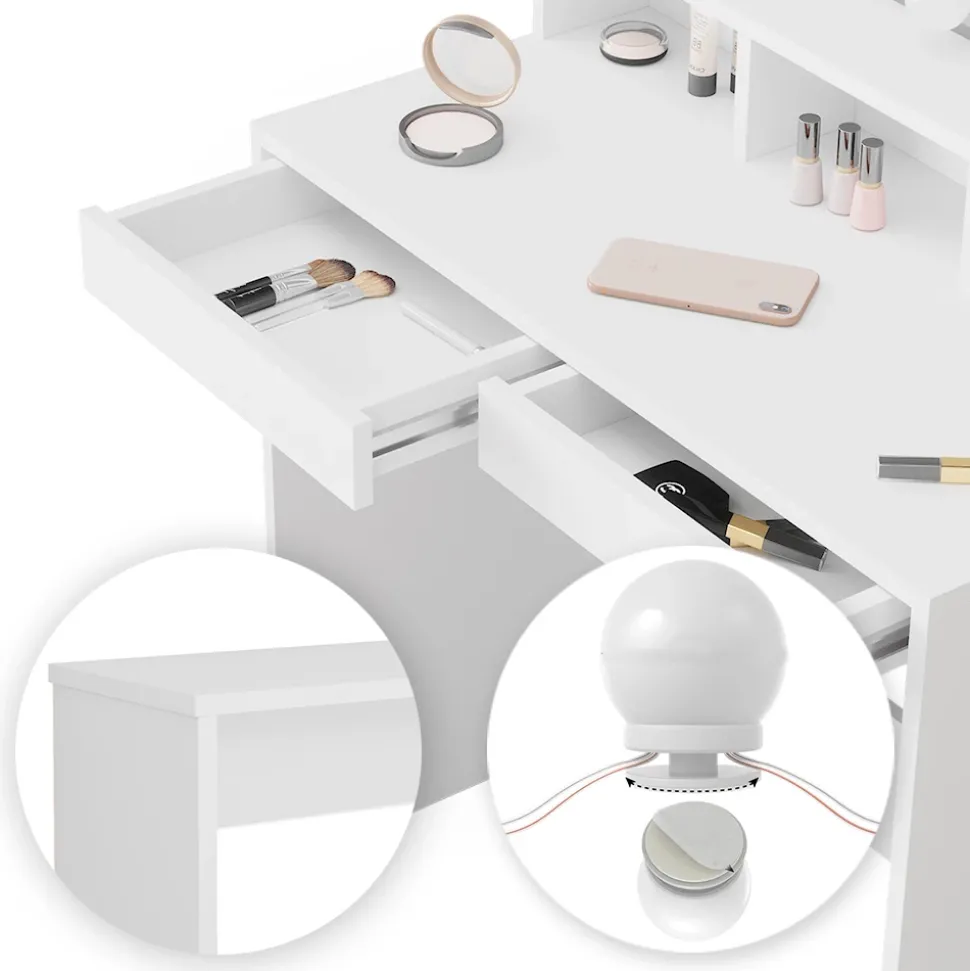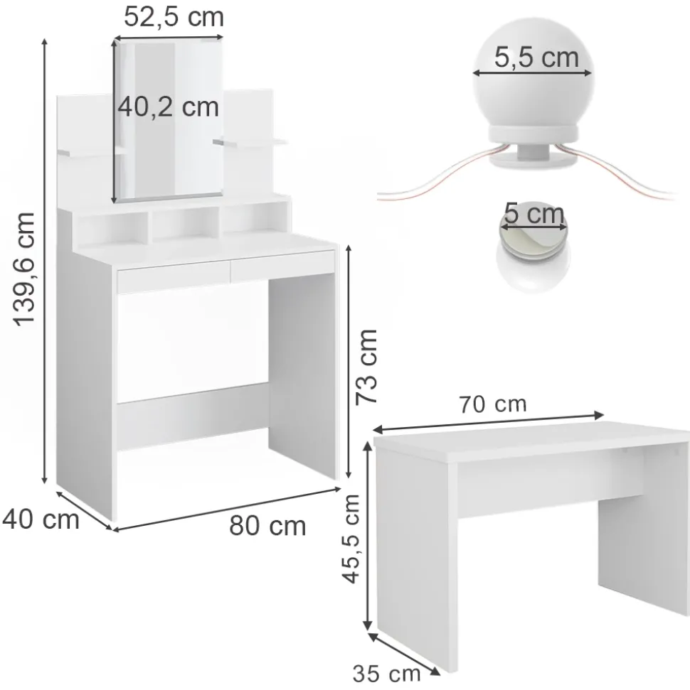 - LIEFERUMFANG: Schminktisch, Sitzbank, LED-Lichterkette, Montageanleitung, Montagematerial