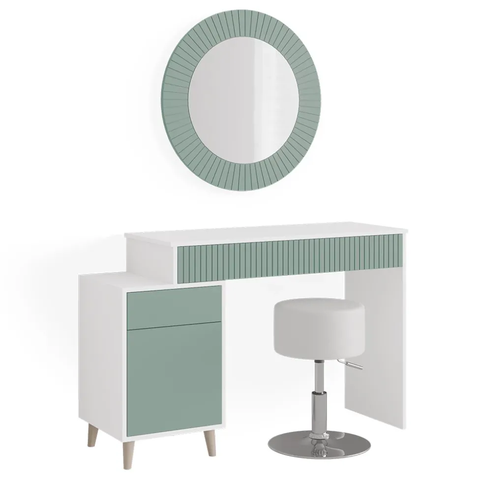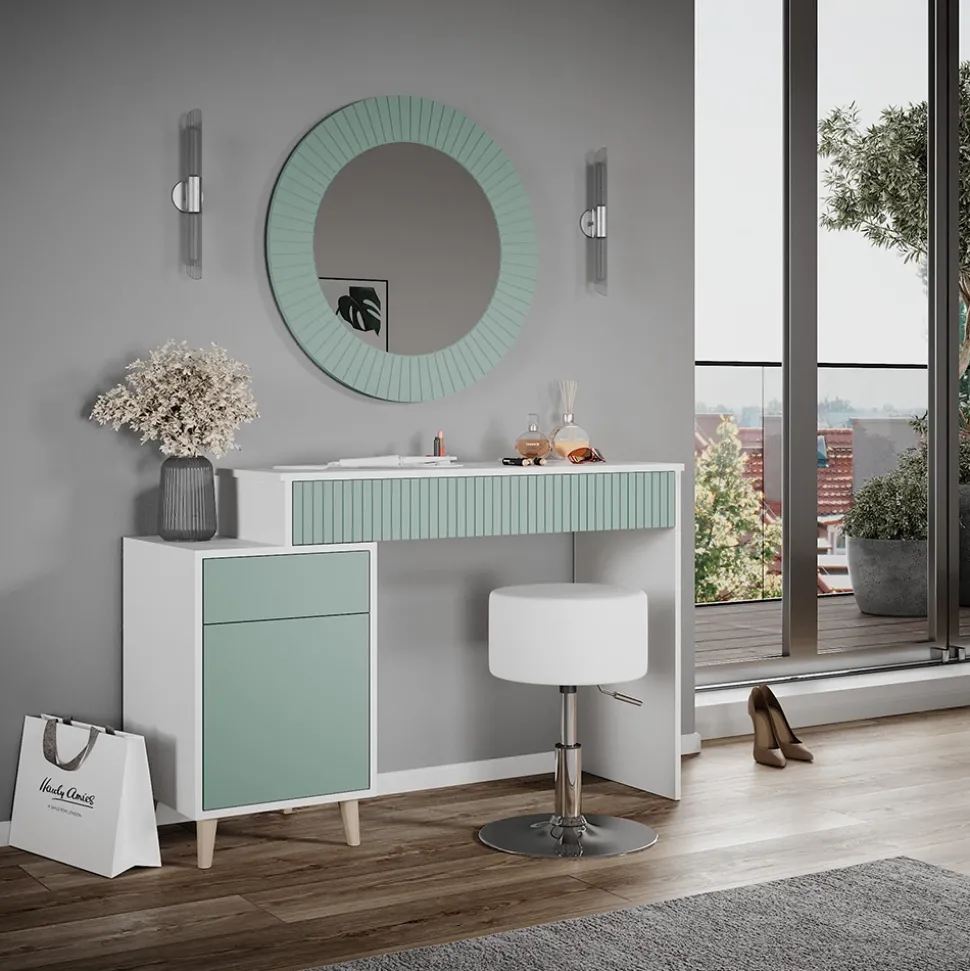 Der Schminktisch Arles mit Hocker ist ein wahrhaft stilvolles Möbelstück, das perfekt in das moderne oder auch Vintage-Ambiente passt. Mit seinem Retro-Look und dem eleganten, runden Spiegel ist der Schminktisch eine wahre Augenweide und wird jeden Raum optisch aufwerten. Ausgestattet mit zwei geschlossenen Regalen und zwei einziehbaren Schubladen bietet der Tisch viel Stauraum für Ihre Schmink- und Frisierutensilien. Der bequeme Hocker macht das Styling-Erlebnis komplett! Dieses Schminktischmodell ist in verschiedenen Ausführungen erhältlich, so dass Sie sicherlich den perfekten Arles Tisch für Ihr Zuhause finden werden. Gönnen Sie sich ein wenig Luxus und lassen Sie sich von dem Arles Schminktisch verzaubern!