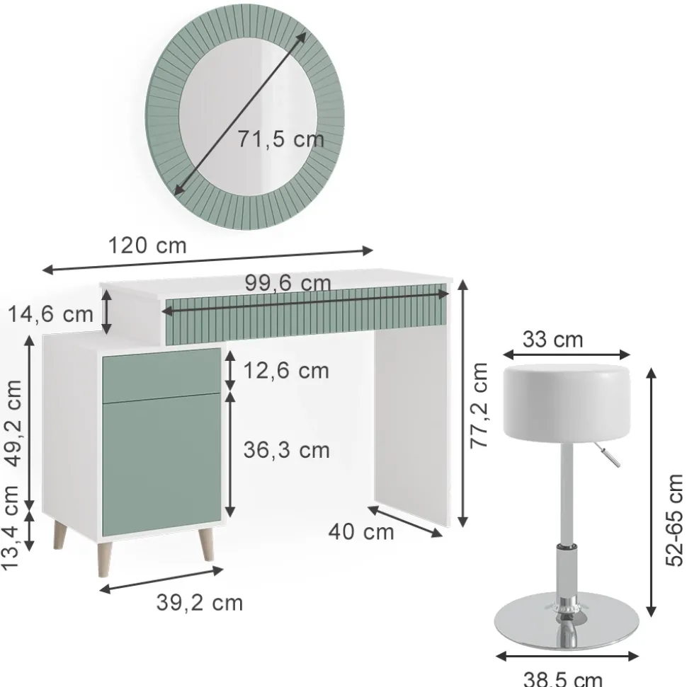 - MATERIAL: Die Schminkkommode besteht aus pflegeleichter Spanplatte 16 mm, mit einer Melaminharzbeschichtung