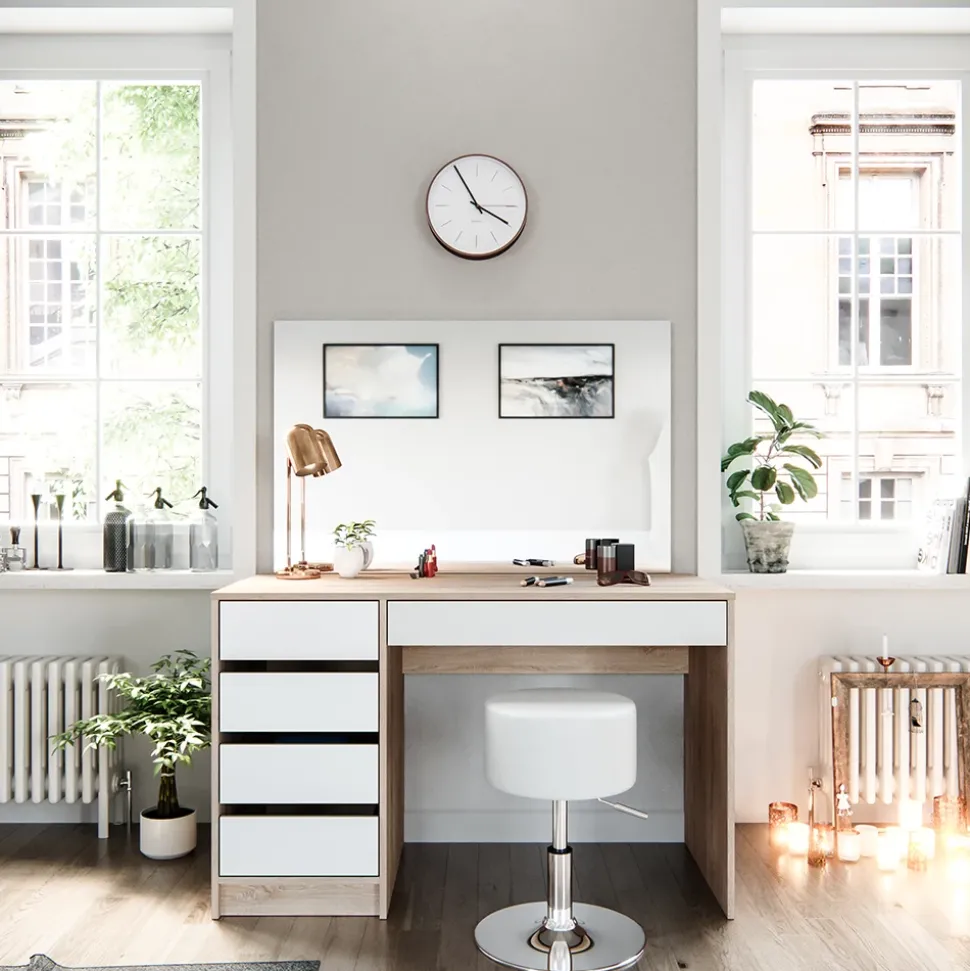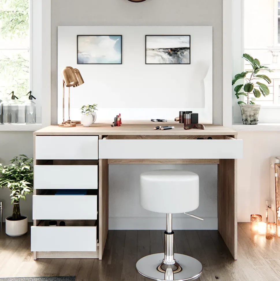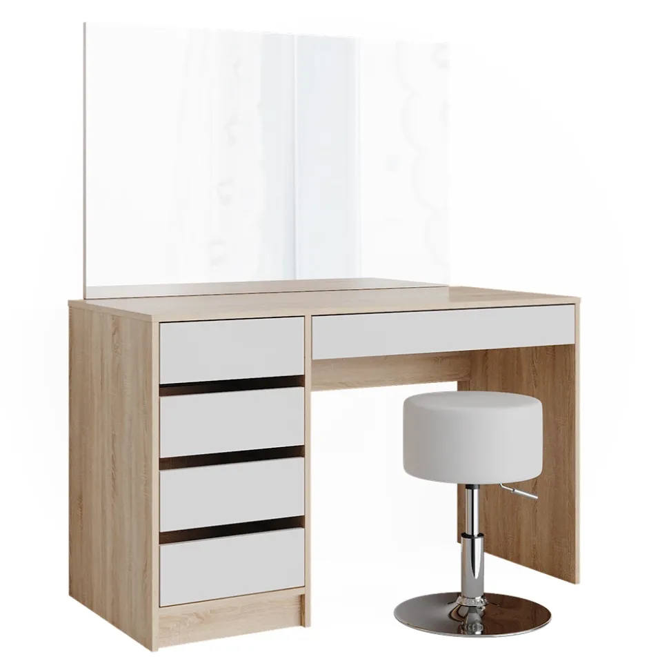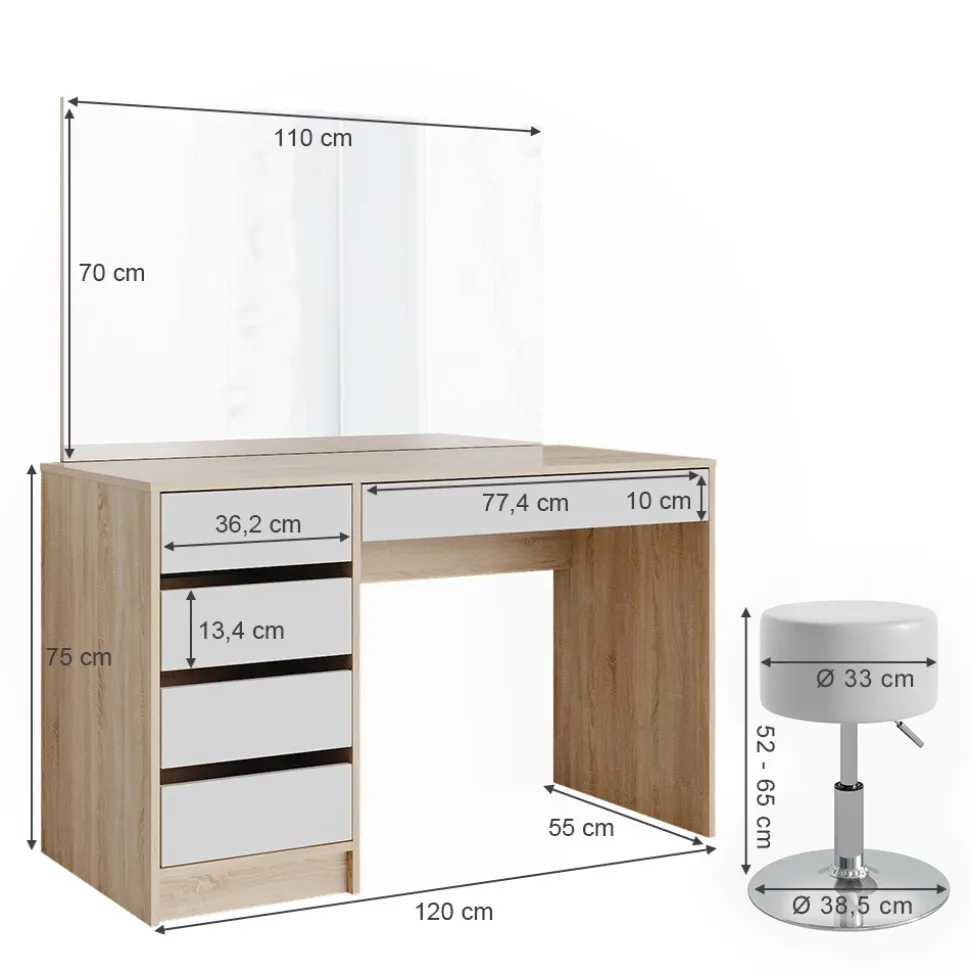 Der Schminktisch Sherry mit Hocker ist das perfekte Upgrade für Ihr Schlafzimmer oder Badezimmer. Mit seinen fünf geschlossenen Fachböden bietet dieser Frisiertisch genügend Stauraum für all Ihre Kosmetikartikel. Das funktionelle Design und die robuste Konstruktion machen ihn zu einem langlebigen Begleiter für Ihre tägliche Schönheitsroutine. Der große rechteckige Spiegel ermöglicht es Ihnen, jedes Detail Ihres Make-ups perfekt zu sehen. Und das Beste ist, dass dieses Schminktischmodell in verschiedenen Ausführungen erhältlich ist, um Ihren einzigartigen Stil zu ergänzen. Ein Schminktisch wie Sherry verleiht Ihrem Zimmer eine charmante Note und lädt Sie ein, sich wie eine wahre Königin zu fühlen. Träumen Sie nicht länger von einem perfekten Schminktisch – machen Sie Sherry zu Ihrem treuen Begleiter!