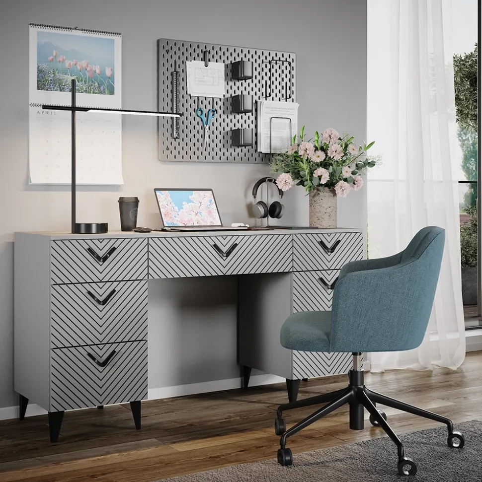- Der Arbeitstisch für das Büro bietet ein funktionelles Design und viel Stauraum, um Ihre Arbeitsumgebung aufgeräumt zu halten. Das Siebdruck-Motiv verleiht dem Schreibtisch eine persönliche Note.
