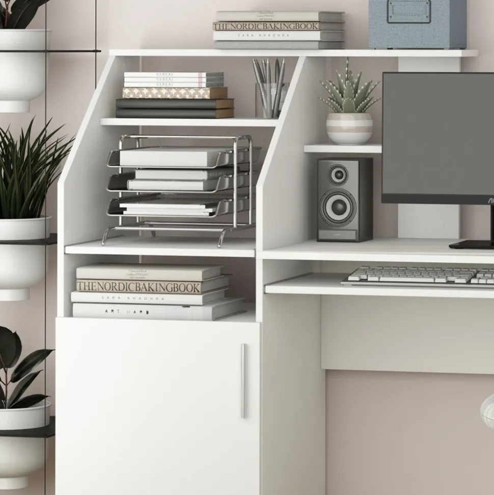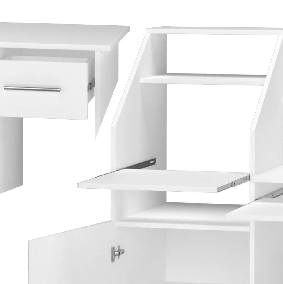 - Der Arbeitstisch für das Büro bietet eine ausziehbare Schublade und offene Regale für die Aufbewahrung von Arbeitsmaterialien sowie ein Regal für die Systemeinheit.
