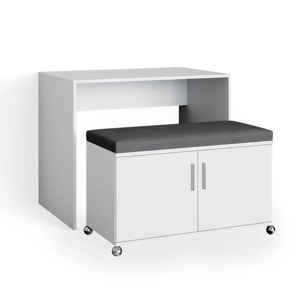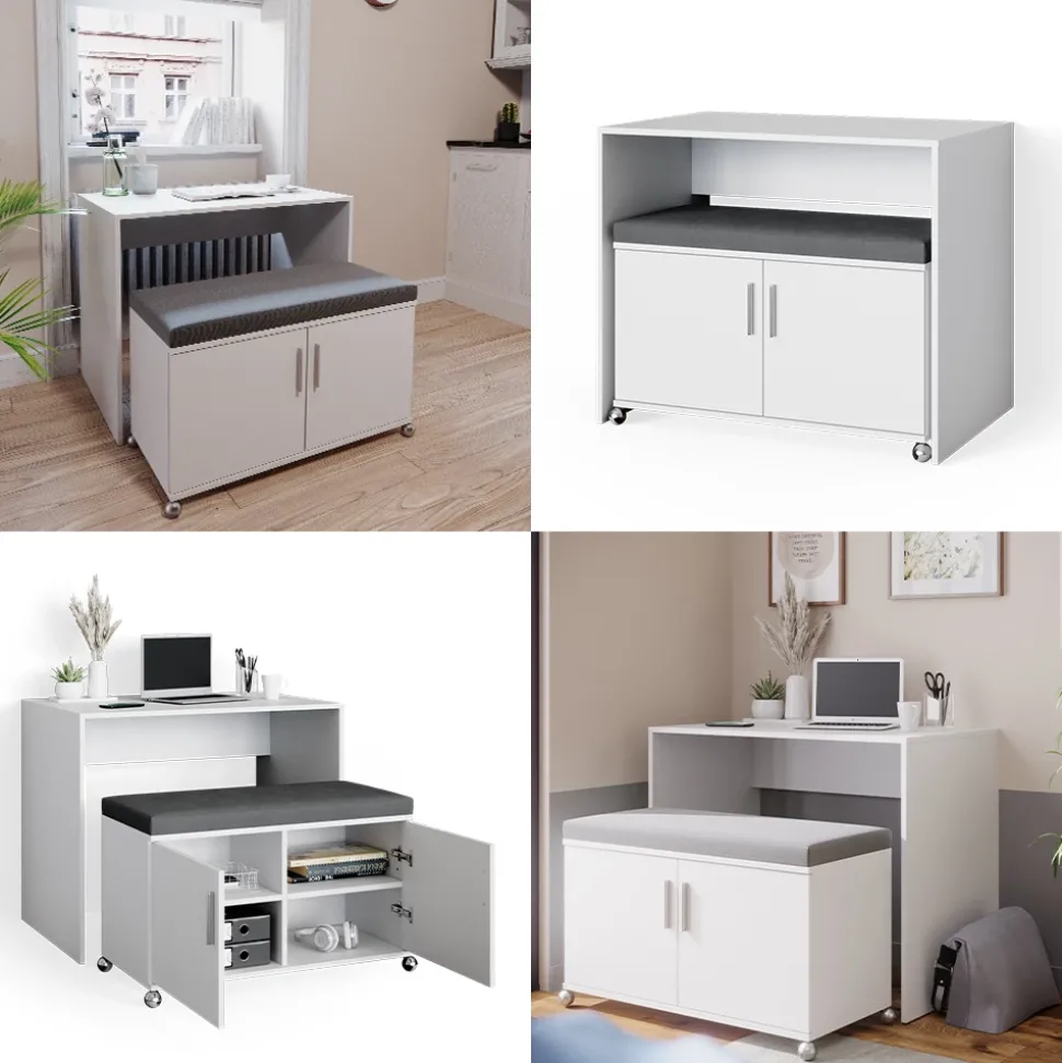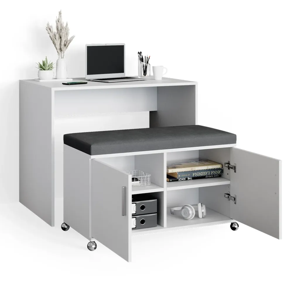 - Der Arbeitstisch für das Büro ist die ideale Wahl für kleine Räume, da er über einen ausziehbaren Sockel-Sitz und vier geschlossene Ablagen verfügt.
