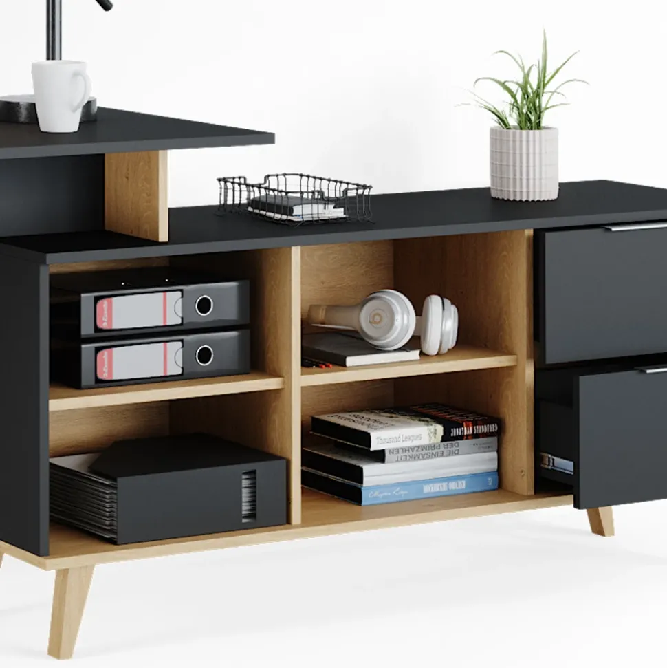 - MAßE: Der Bürotisch mit Stauraum hat eine Breite von 138 cm, eine Höhe von 77 cm und eine Tiefe von 60 cm. Alle detaillierten Größen sind auf den Fotos angegeben.