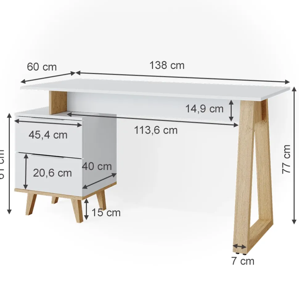 - MAßE: Der Bürotisch mit Stauraum hat eine Breite von 138 cm, eine Höhe von 77 cm und eine Tiefe von 60 cm. Alle detaillierten Größen sind auf den Fotos angegeben.