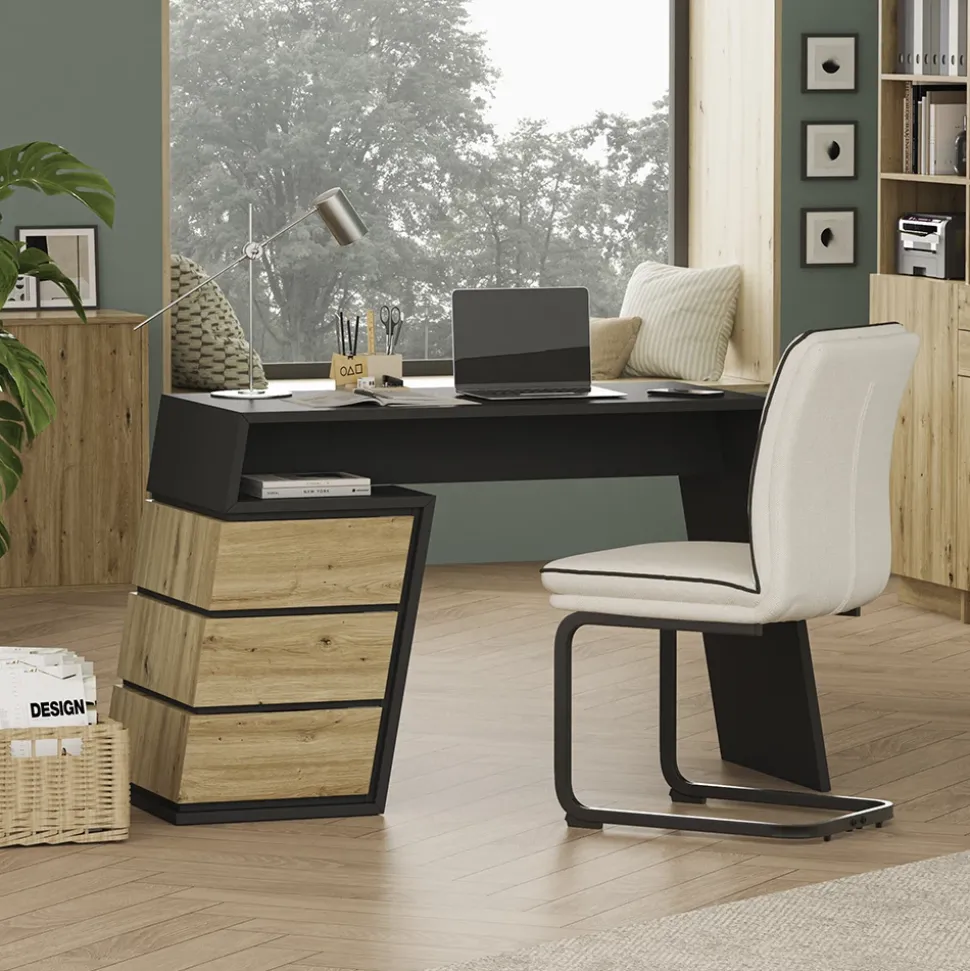 Mit dem Schreibtisch Okaro gehen Funktionalität und Stil Hand in Hand. Dieser Arbeitsplatz ist nicht nur ein einfacher Schreibtisch, sondern bietet auch viel Stauraum mit seinen drei geräumigen Schubladen. Egal ob im Büro oder im Homeoffice – der Okaro Schreibtisch ist der perfekte Partner für produktives Arbeiten. Seine große Tischplatte bietet genügend Platz für Computer, Unterlagen und persönliche Gegenstände. Durch sein stilvolles Design fügt sich der Bürotisch nahtlos in jedes Raumkonzept ein und ist gut kompatibel mit anderen Möbelstücken. Gönnen Sie sich diesen praktischen und gleichzeitig ästhetischen Arbeitsplatz und steigern Sie Ihre Effizienz und Freude an der Arbeit!