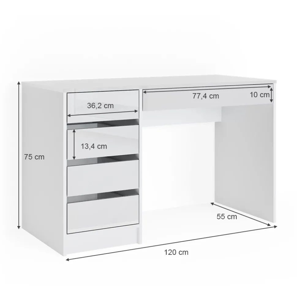 - MAßE: Der Bürotisch mit Stauraum, ohne Spiegel, hat folgende Maße: Breite: 55 cm, Höhe: 75 cm, Tiefe: 120 cm