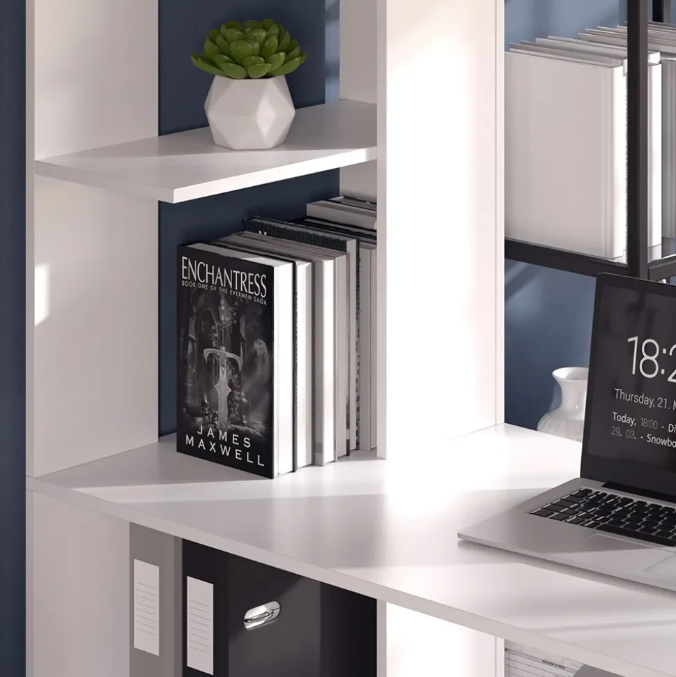 - Der Arbeitstisch für das Büro verfügt über ein praktisches Seitenregal mit 4 Fächern und bietet somit eine platzsparende und komfortable Arbeitsumgebung.