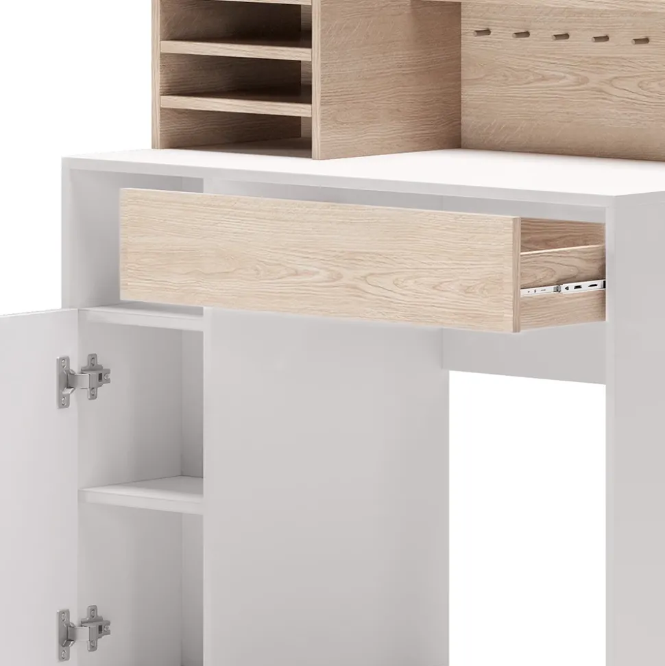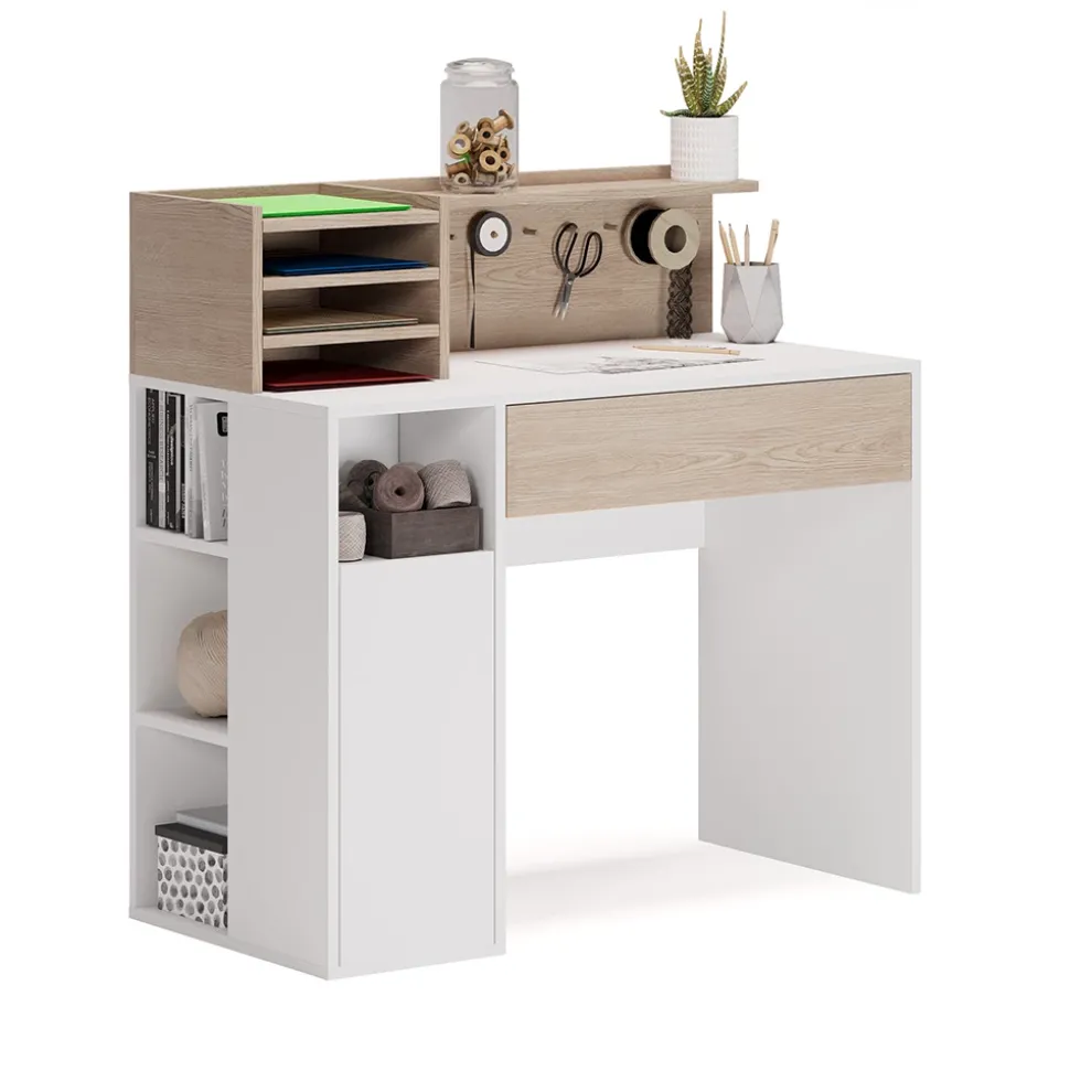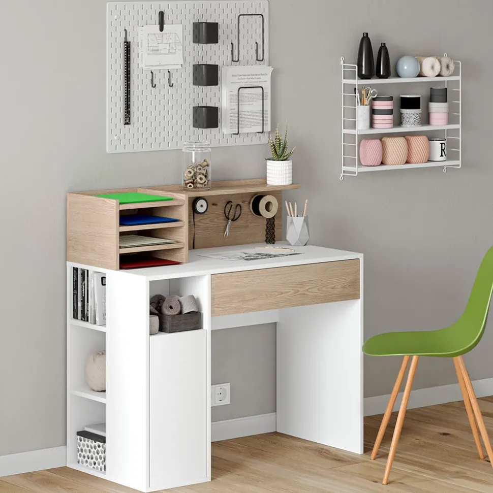 - Dieser Arbeitstisch für das Büro verfügt über eine ausziehbare Schublade sowie offene Regale und ist ideal für Bastel- und Näharbeiten.