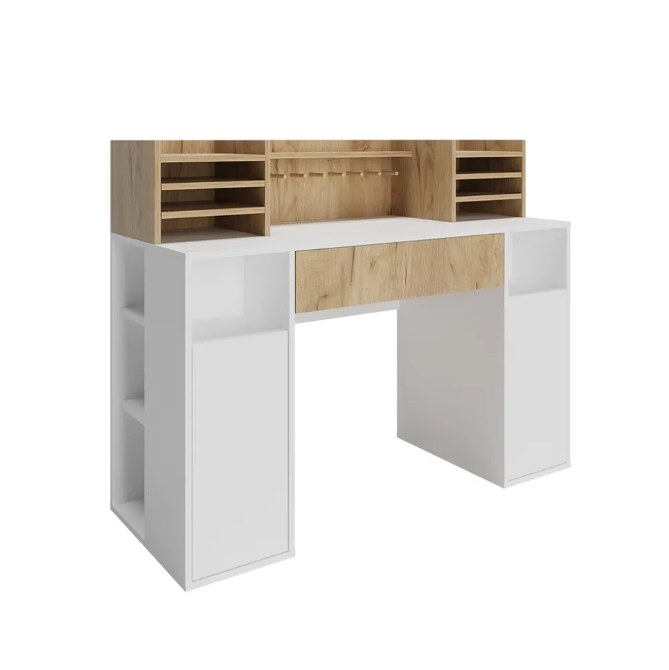 Schaffen Sie Ordnung und finden Sie alles schnell. Offene Regale bieten leichten Zugriff – ein effizienter Arbeitsplatz im Arbeitszimmer. Verwandeln Sie Räume in kreative Oasen. Ob Arbeit, Studium, Basteln oder Gestalten – dieser Tisch passt sich an und inspiriert. Die sorgfältig ausgewählten Materialien und die durchdachte Konstruktion garantieren Langlebigkeit und Belastbarkeit. Die Oberflächen dieses Tisches sind so gestaltet, dass sie sich mühelos reinigen lassen. Ein feuchtes Tuch genügt, um Verschmutzungen zu entfernen.
