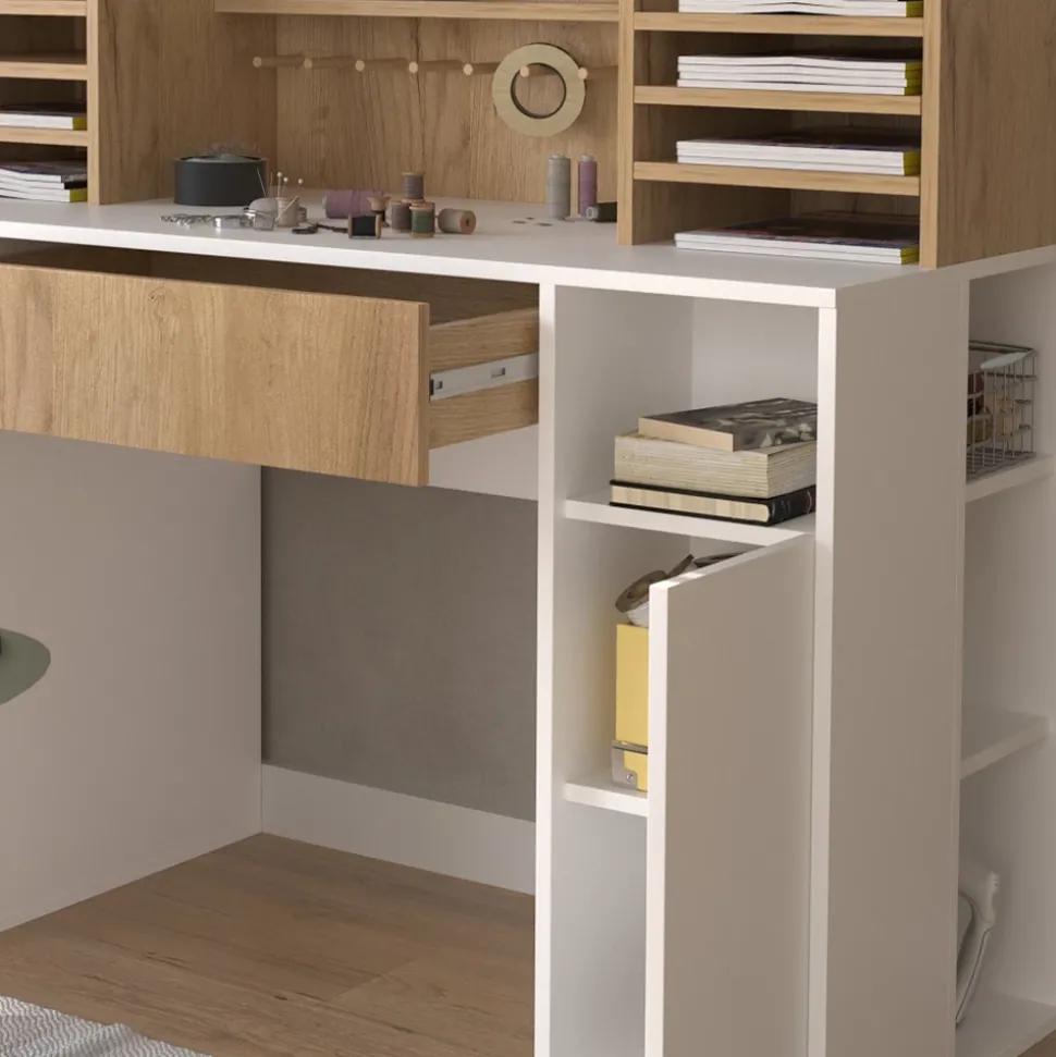 - Optimieren Sie Ihren Arbeitsplatz mit dem Vicco Basteltisch XL in Weiß-Sonoma. Offene Regale, Türen und ein Schubfach bieten eine effiziente Organisation im Arbeits-, Hobby- oder Kinderzimmer.