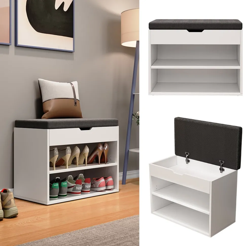 - MAßE: Der Schuhschrank mit Sitzbank hat folgende Abmessungen: Breite: 60 cm, Höhe: 45 cm, Tiefe: 30 cm. Alle detaillierten Größen sind auf den Fotos angegeben.
