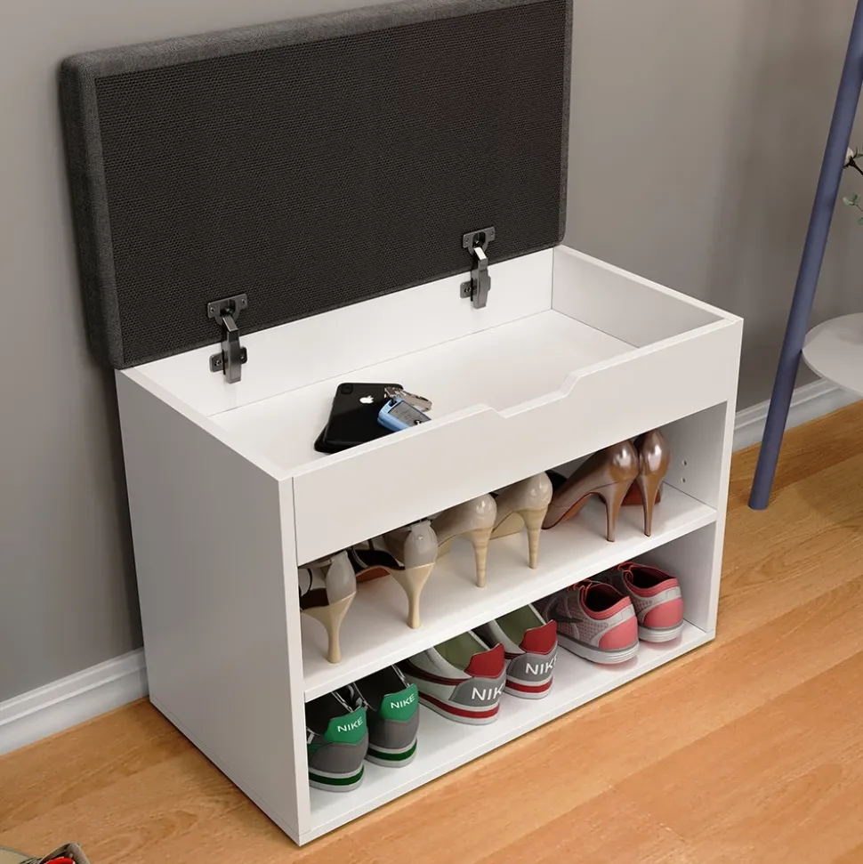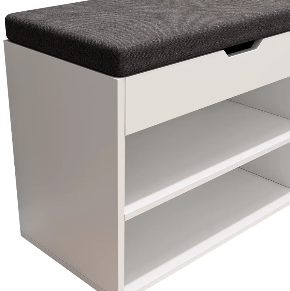 - Mit ihrer schlichten Optik und modernem Design vereint das Schuhregal Ästhetik mit Funktionalität und dient gleichzeitig als bequeme Sitzgelegenheit mit Auflage.