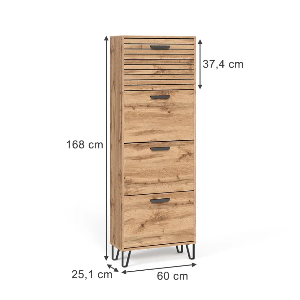 - MAßE: Der Schuhschrank hat eine Tiefe von 25,1 cm, eine Breite von 60 cm und eine Höhe von 168 cm. Die detaillierten Größen sind auf den Fotos angegeben.
