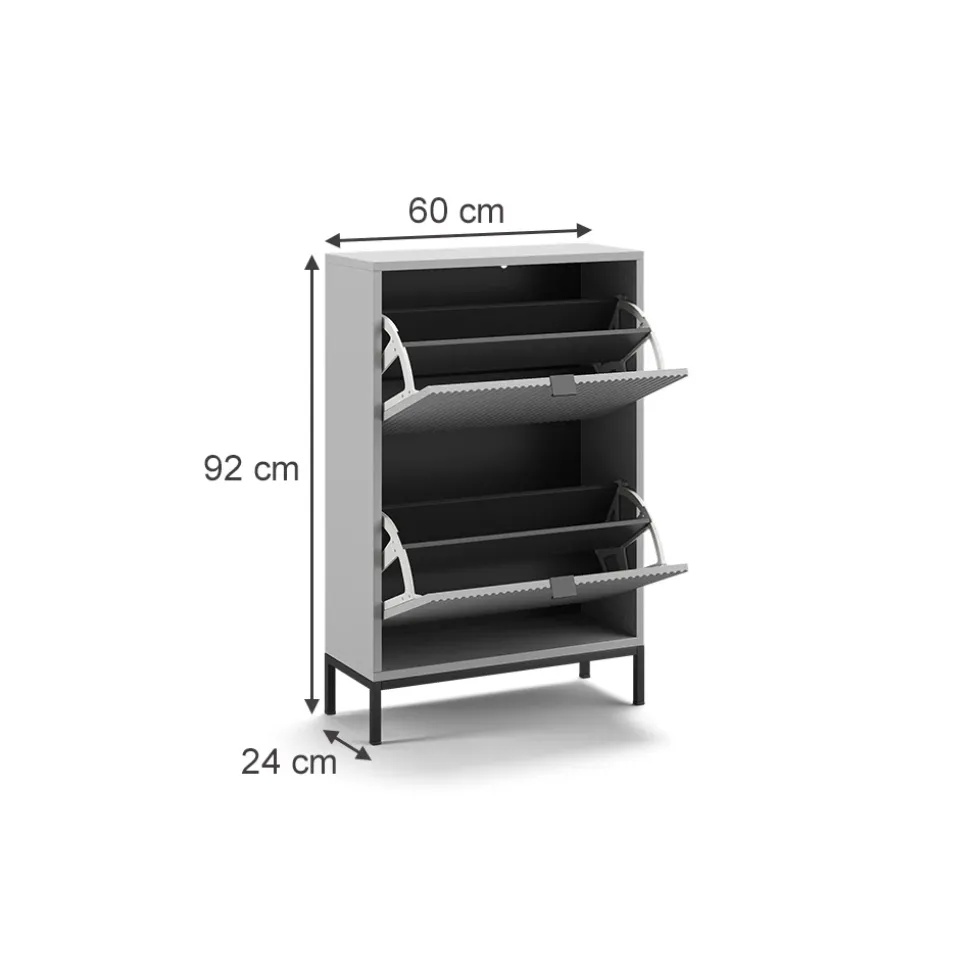- MAßE: Der Schuhschrank hat eine Tiefe von 24 cm, eine Breite von 60 cm und eine Höhe von 92 cm. Die detaillierten Größen sind auf den Fotos angegeben.