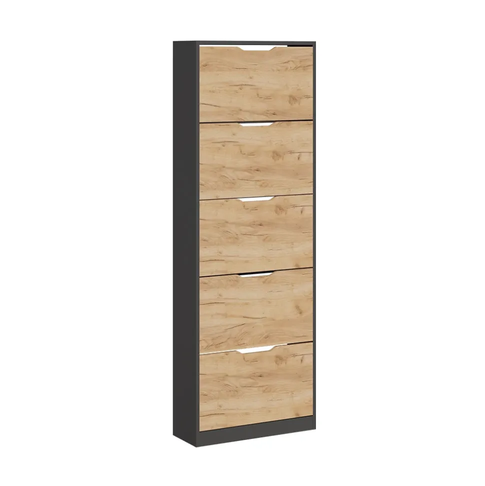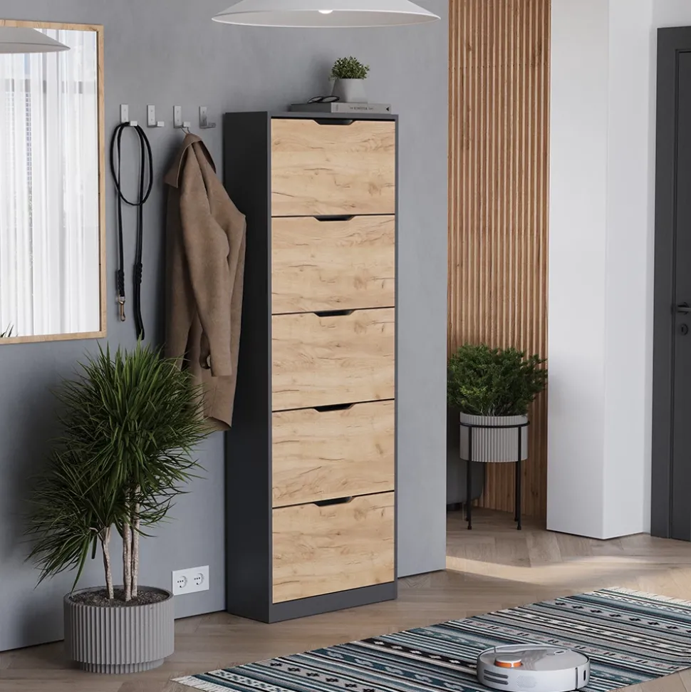 Luca ist ein Schuhkipper, der perfekt in jeden modernen Flur passt. Mit seinen 5 klappbaren Schuhregalen bietet er reichlich Stauraum für viele Paare Schuhe. Der Schuhkipper ist nicht nur äußerst praktisch, sondern auch platzsparend und kann daher auch in kleineren Fluren eingesetzt werden. Luca ist kompatibel mit anderen Artikeln der Kollektion und kann so perfekt mit anderen Möbelstücken kombiniert werden, um ein stimmiges Gesamtbild zu erzielen. Der Schuhkipper Luca ist die perfekte Lösung für alle, die auf der Suche nach einem praktischen und stilvollen Schuhschrank sind. Überzeugen Sie sich selbst von der Qualität und Funktionalität von Luca und schaffen Sie sich damit eine aufgeräumte und stylische Eingangshalle.