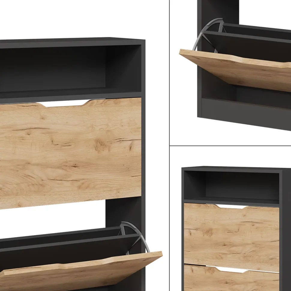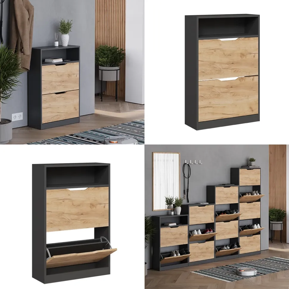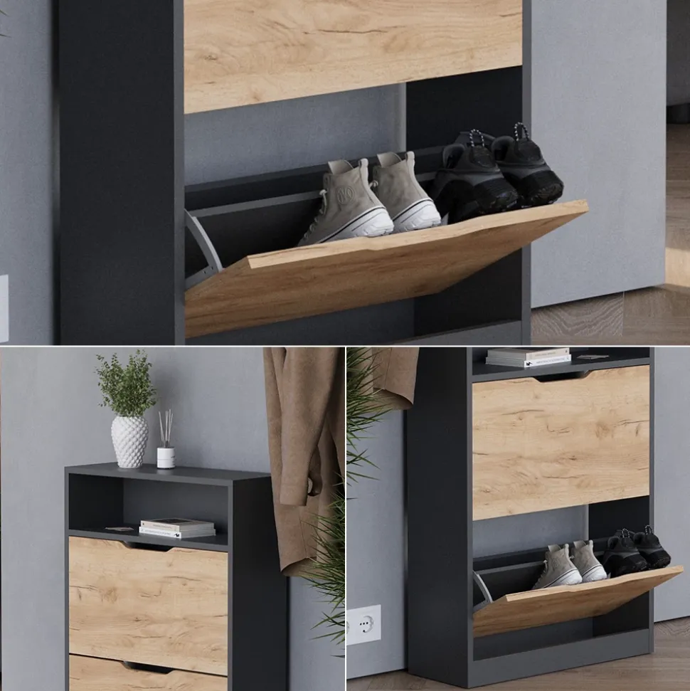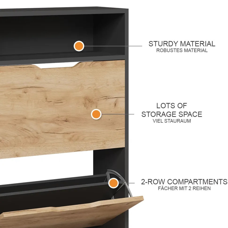 - MAßE: Der Schuhschrank mit 2 Fächern hat eine Tiefe von 22 cm, eine Breite von 59 cm und eine Höhe von 89,5 cm. Alle detaillierten Größen sind auf den Fotos angegeben.