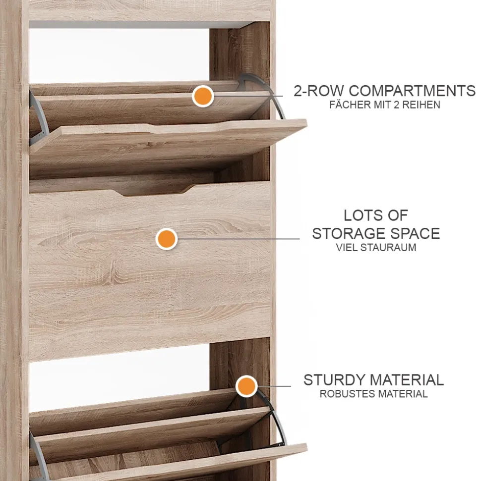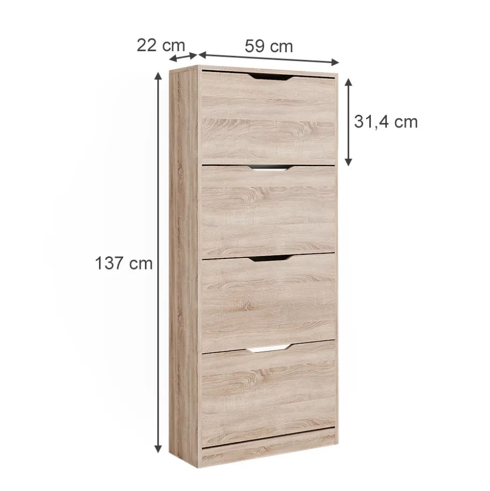 - MAßE: Der Schuhschrank hat eine Tiefe von 22 cm, eine Breite von 59 cm und eine Höhe von 137 cm. Alle detaillierten Größen sind auf den Fotos angegeben.