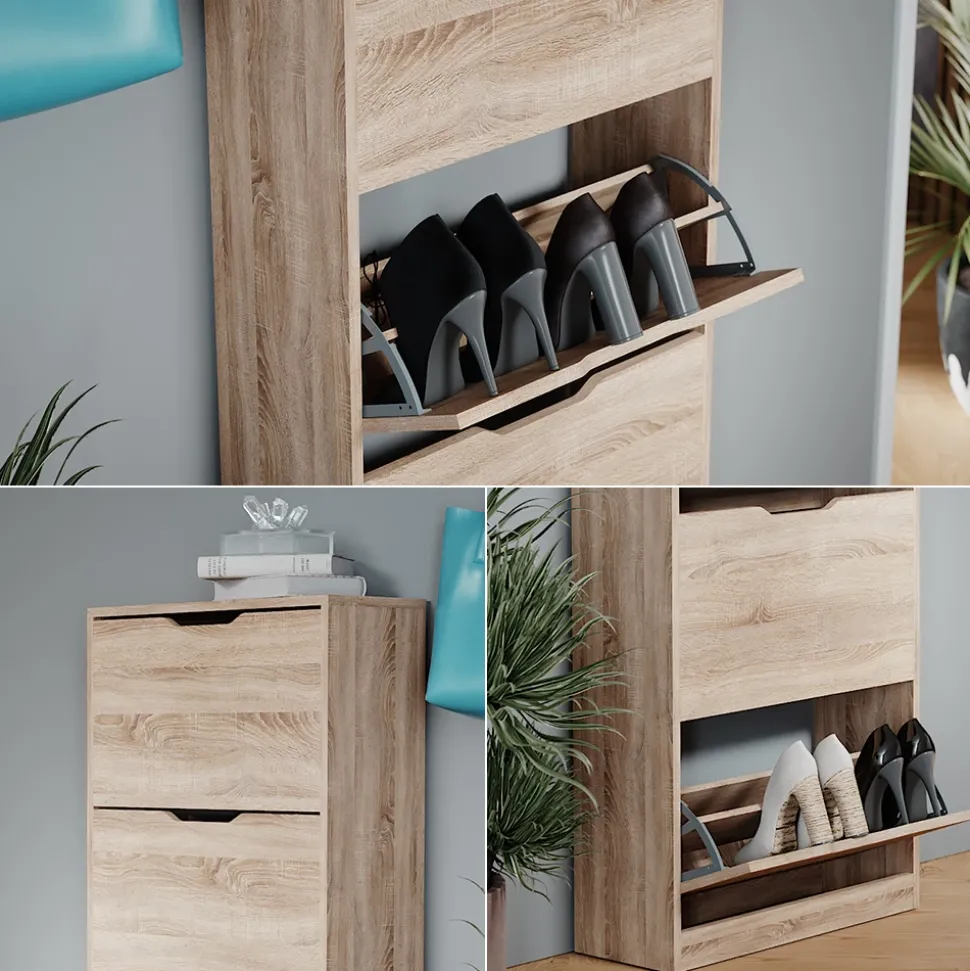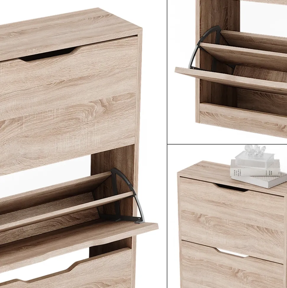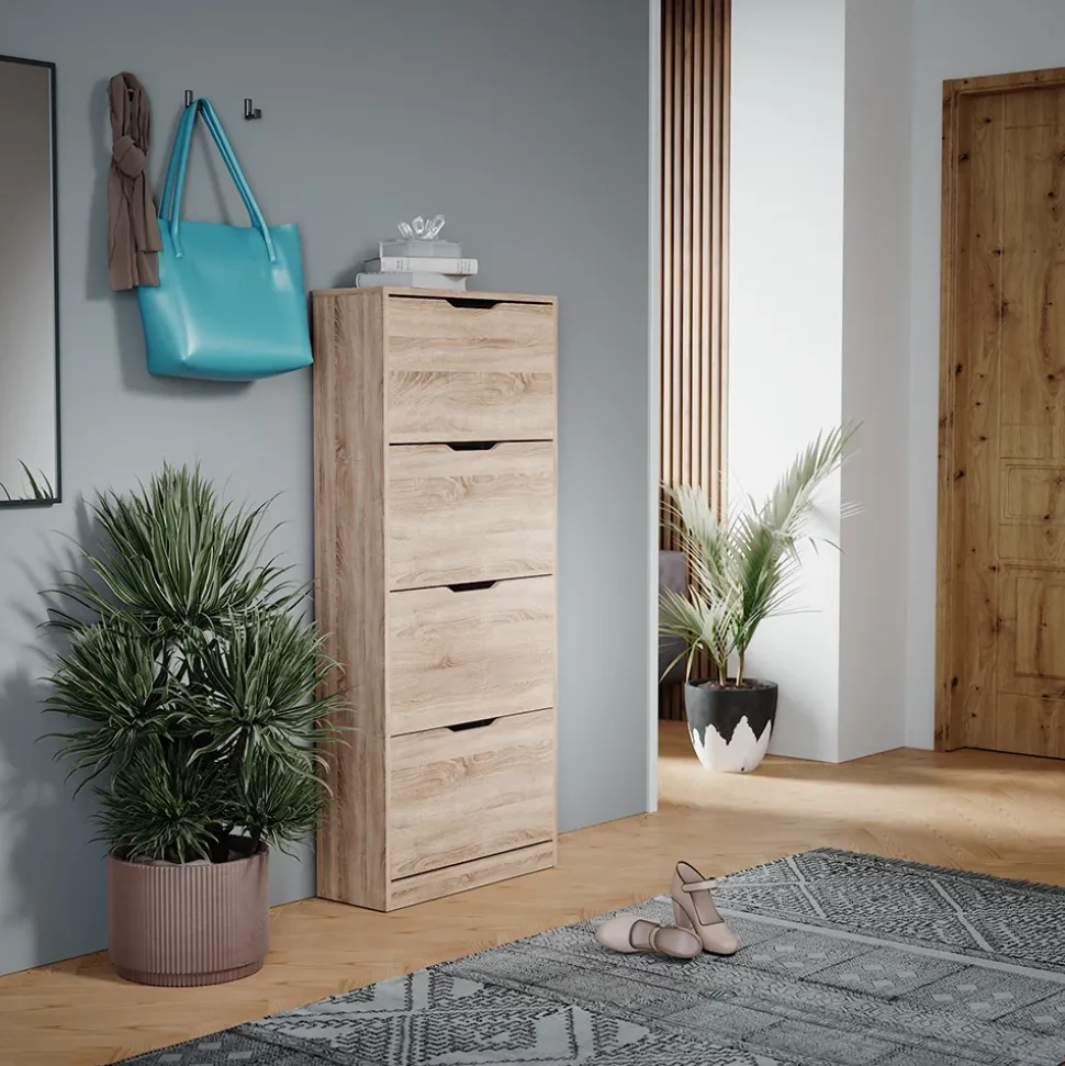 - Das Schuhregal verfügt über 4 praktische Klappschubladen und lässt sich problemlos mit anderen Möbeln kombinieren, um mehr Stauraum und Organisation in Ihrem Zuhause zu schaffen.