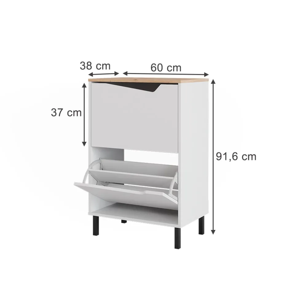 - MAßE: Der Schuhschrank hat eine Tiefe von 38 cm, eine Breite von 60 cm und eine Höhe von 91,6 cm.