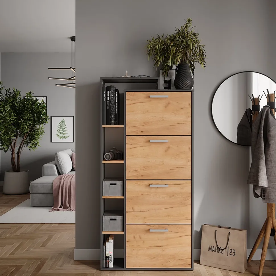 Mit dem Schuhkipper Orlando bekommen Sie nicht nur einen praktischen Schuhschrank für Ihren Flur, sondern auch ein modernes Möbelstück, das Ihr Zuhause aufwertet. Nie wieder chaotische Schuhberge im Eingangsbereich! Der Schuhkipper bietet genug Platz für all Ihre Lieblingsschuhe und sorgt für Ordnung und Übersichtlichkeit. Gönnen Sie sich dieses funktionale und stilvolle Möbelstück und machen Sie Ihren Flur zu einem einladenden und aufgeräumten Bereich in Ihrem Zuhause. Der Schuhkipper Orlando – ein Must-have für jeden, der Wert auf praktische Lösungen und Ästhetik legt!