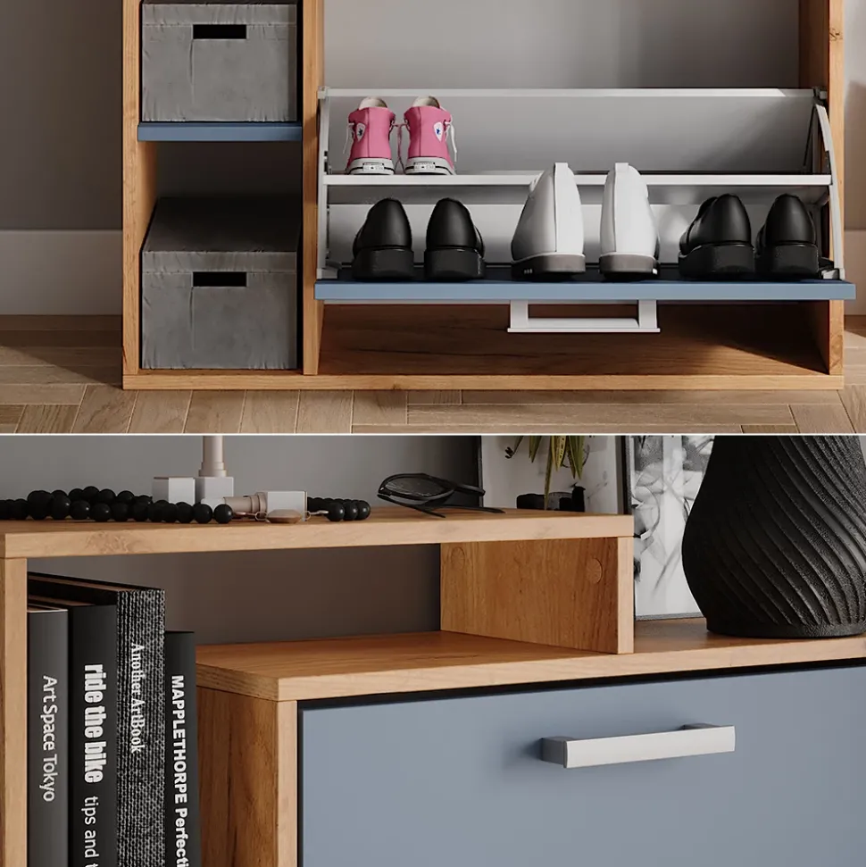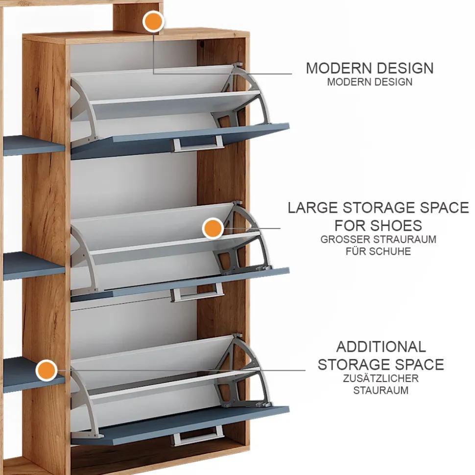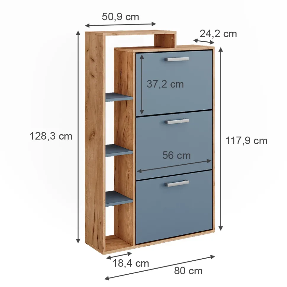 - MAßE: Der Schuhschrank hat eine Tiefe von 24,2 cm, eine Breite von 80 cm und eine Höhe von 128,3 cm. Alle detaillierten Größen sind auf den Fotos angegeben.