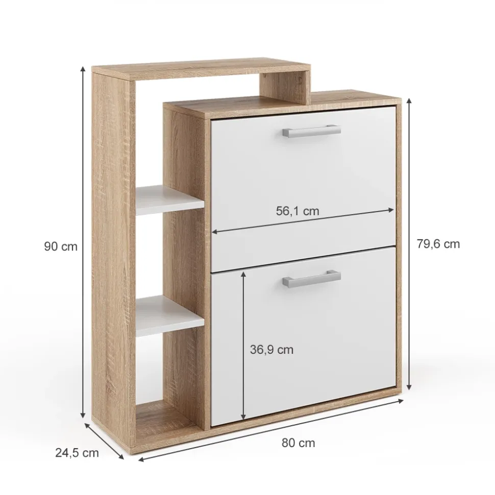 - MAßE: Der Schuhschrank hat eine Breite von 80 cm, eine Höhe von 90 cm und eine Tiefe von 25 cm. Alle detaillierten Größen sind auf den Fotos angegeben.