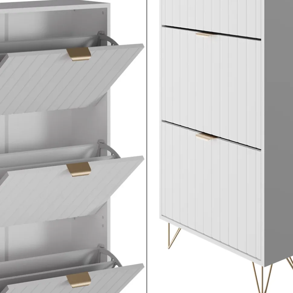 Der Schuhschrank Helge bietet mit seinen drei Fächern eine platzsparende und stilvolle Lösung zur Aufbewahrung von Schuhen. Sein modernes Design passt in viele Wohnbereiche und sorgt für Ordnung im Eingangsbereich.