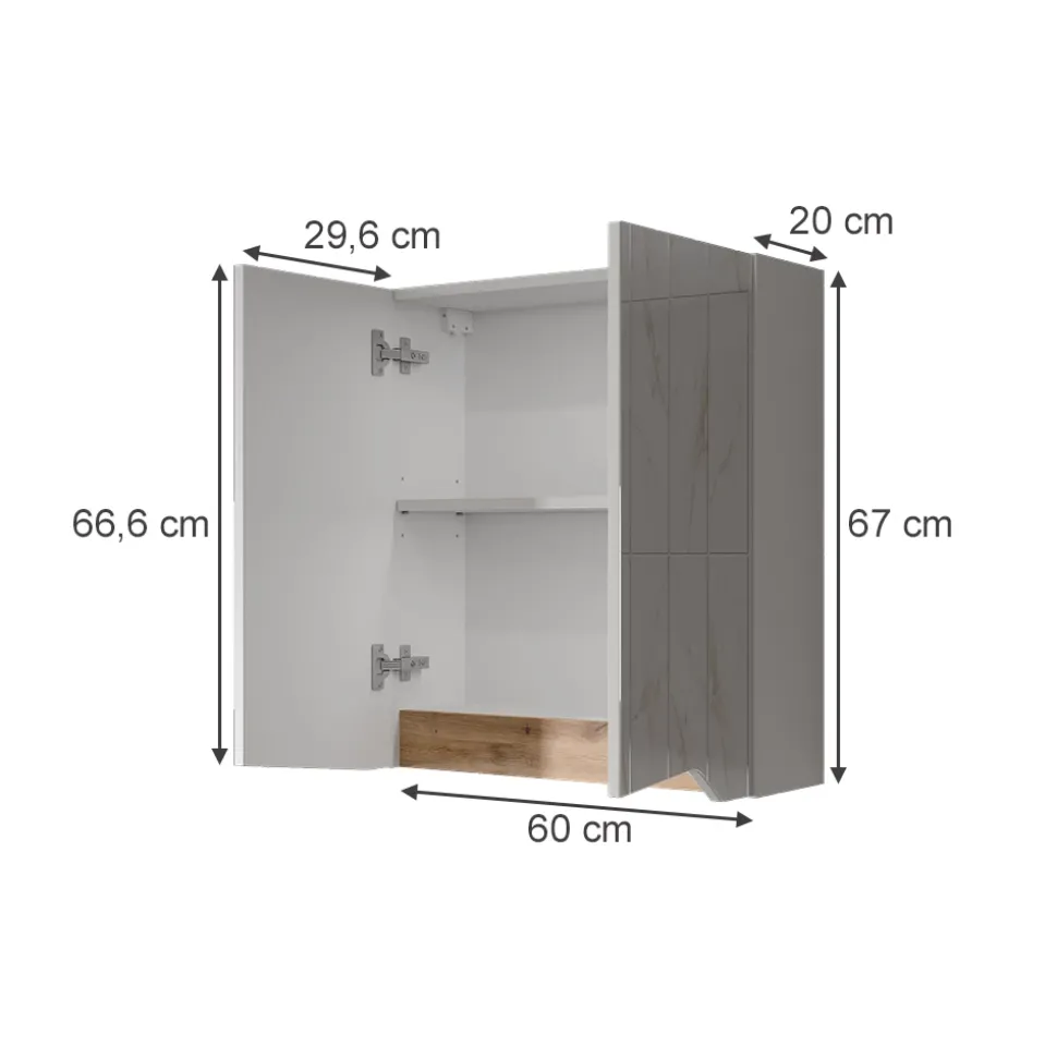 - MAßE: Der Badezimmerschrank mit Spiegel hat mit Regalen eine Tiefe von 20 cm, eine Breite von 60 cm und eine Höhe von 67 cm.