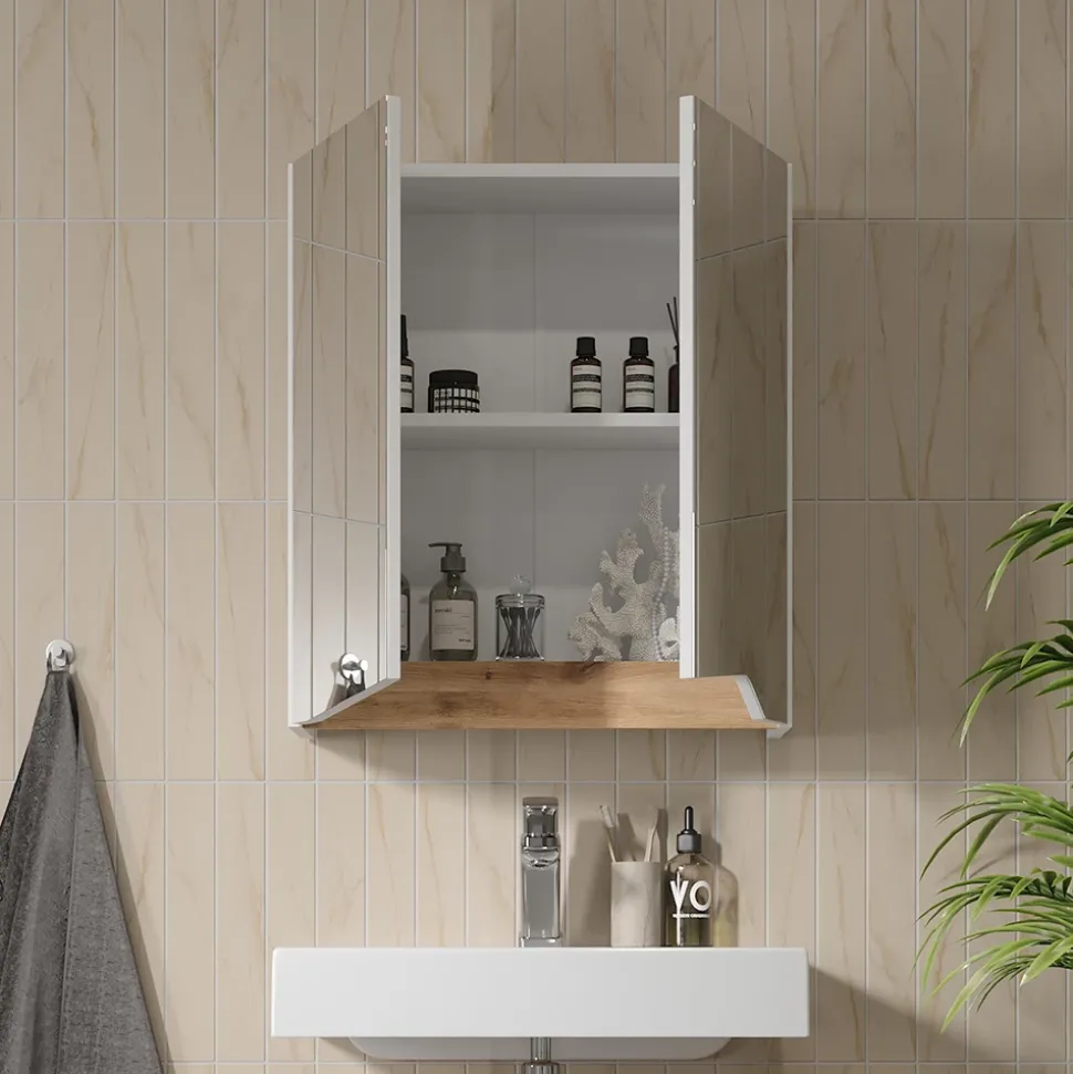 - Der Badezimmerspiegel besticht durch sein kompaktes und modernes Design sowie praktische Spiegeltüren, die das Produkt besonders funktional und ansprechend machen.