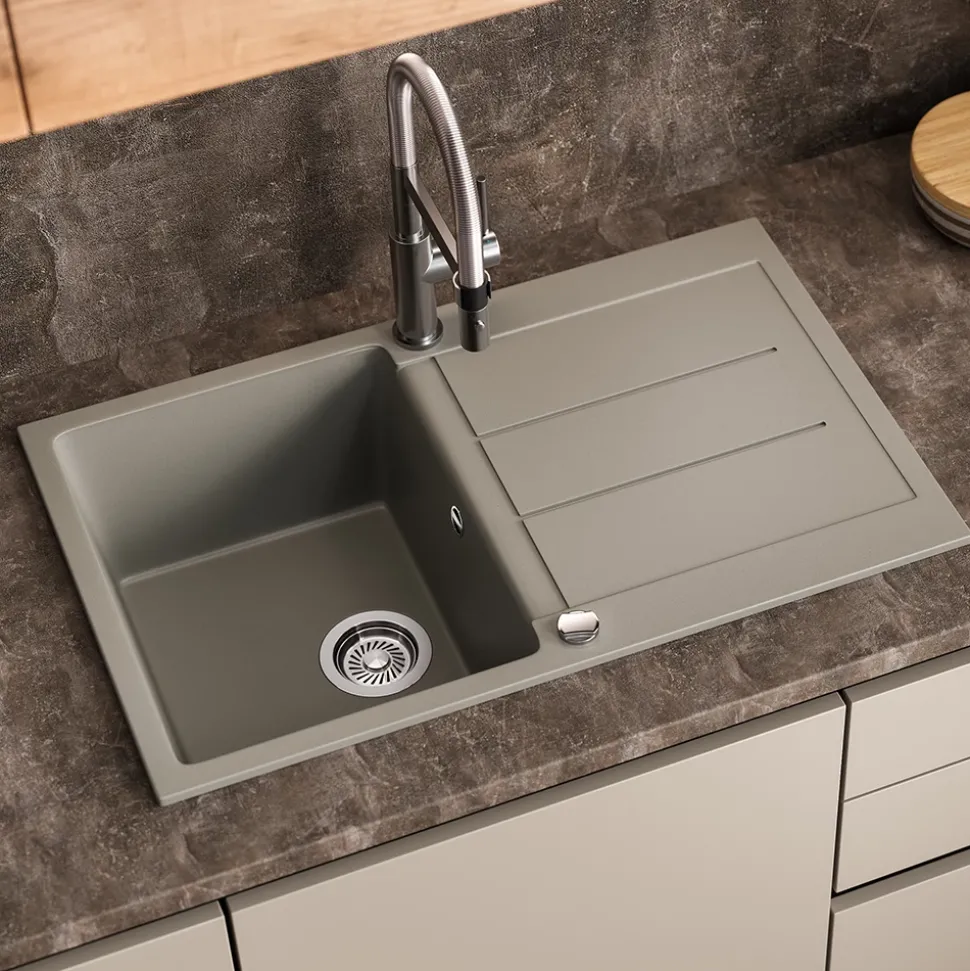 - MATERIAL: Das Spülbecken besteht zu 80 % aus Quarz und 20 % aus speziellen Harzen, was eine pflegeleichte, robuste und langlebige Oberfläche gewährleistet.