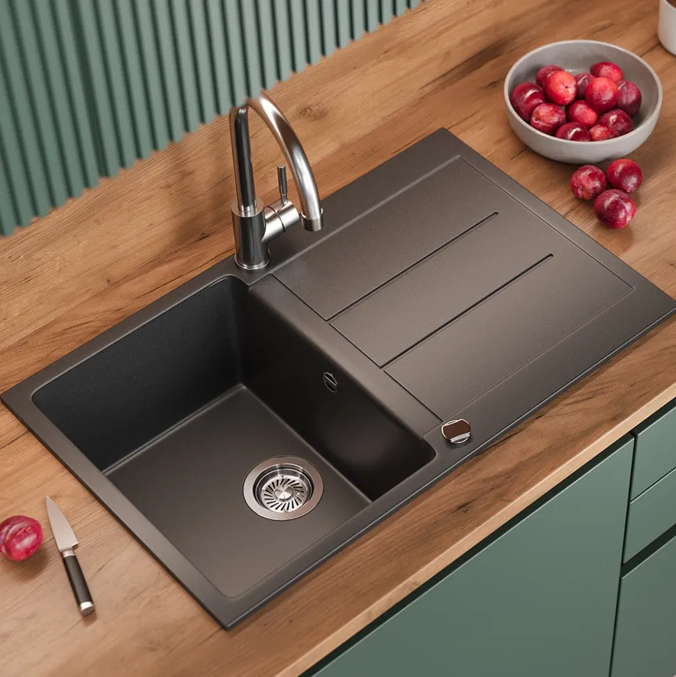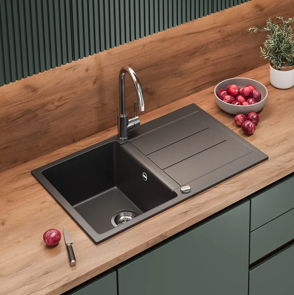 - MATERIAL: Das Spülbecken besteht zu 80 % aus Quarz und 20 % aus speziellen Harzen, was eine pflegeleichte, robuste und langlebige Oberfläche gewährleistet.