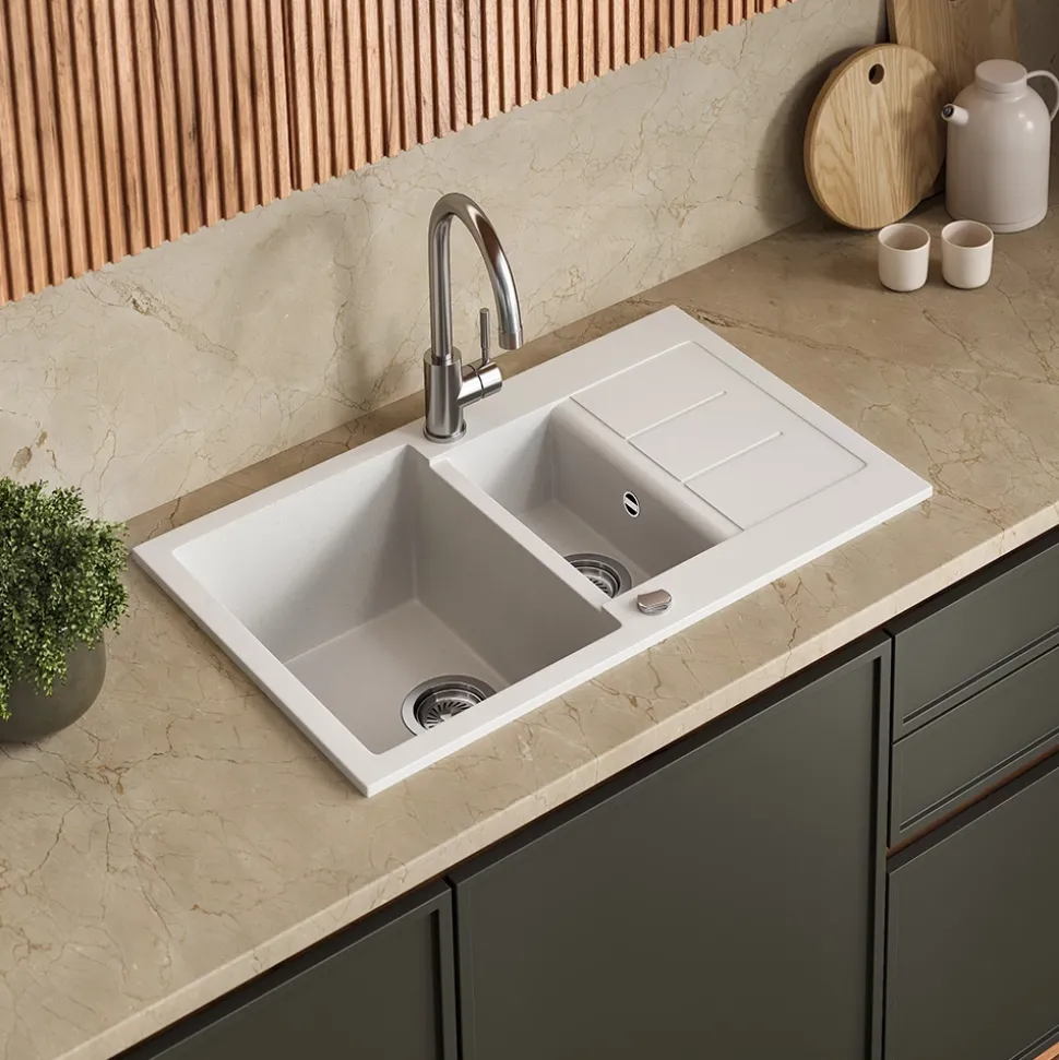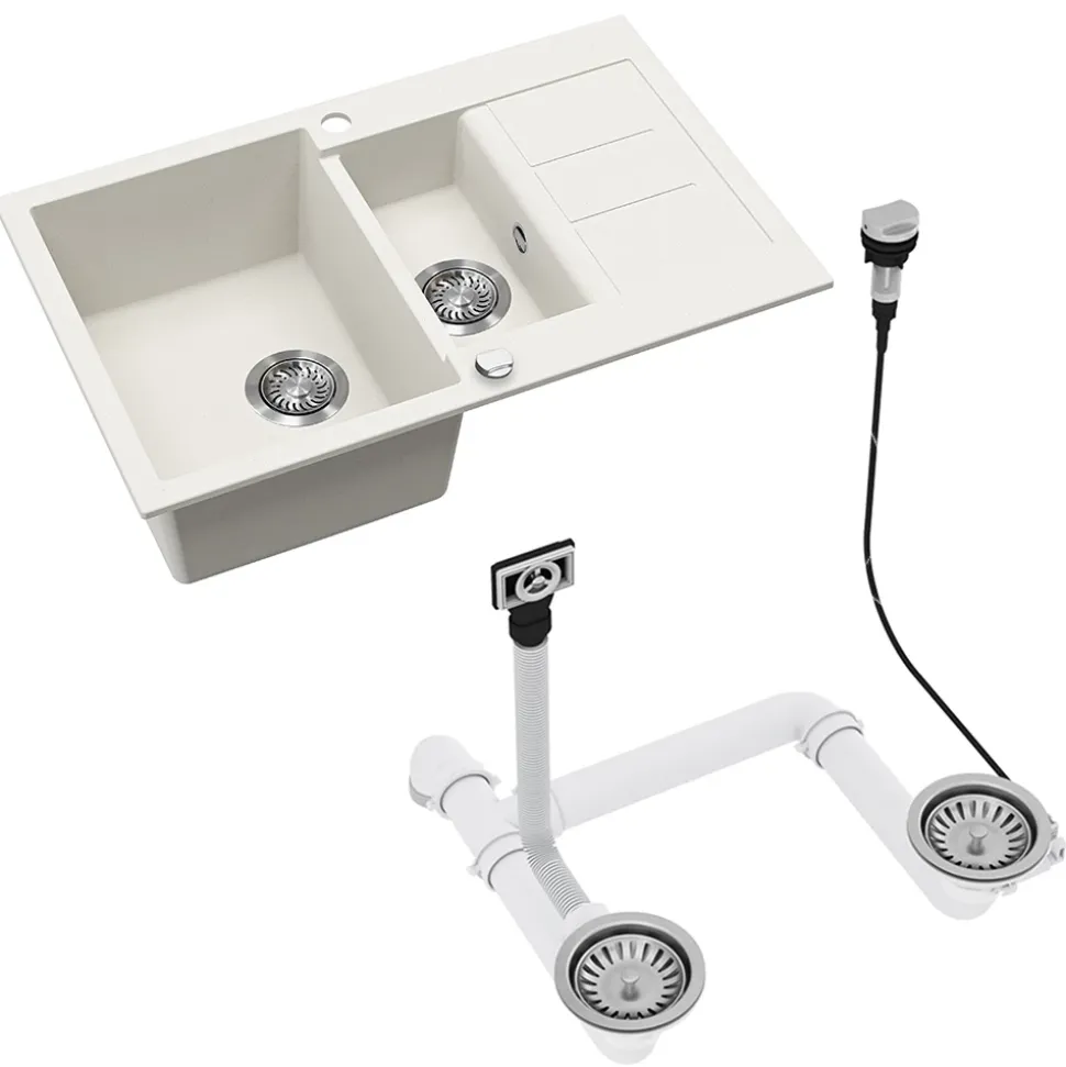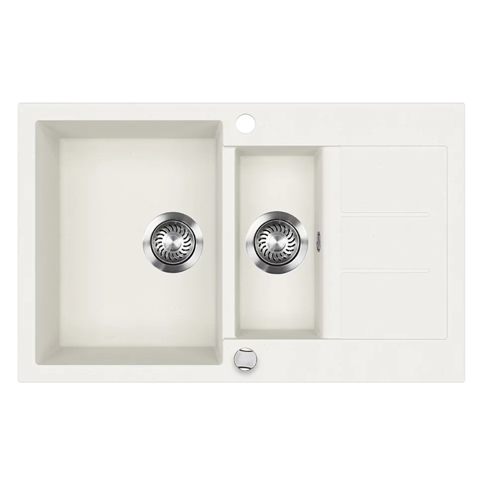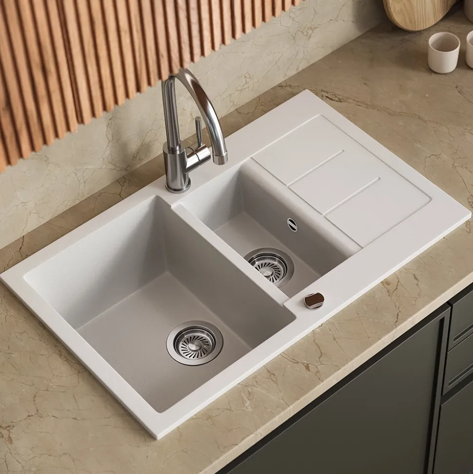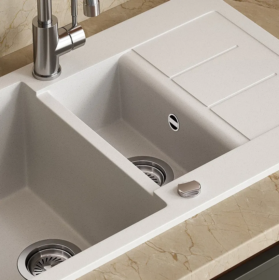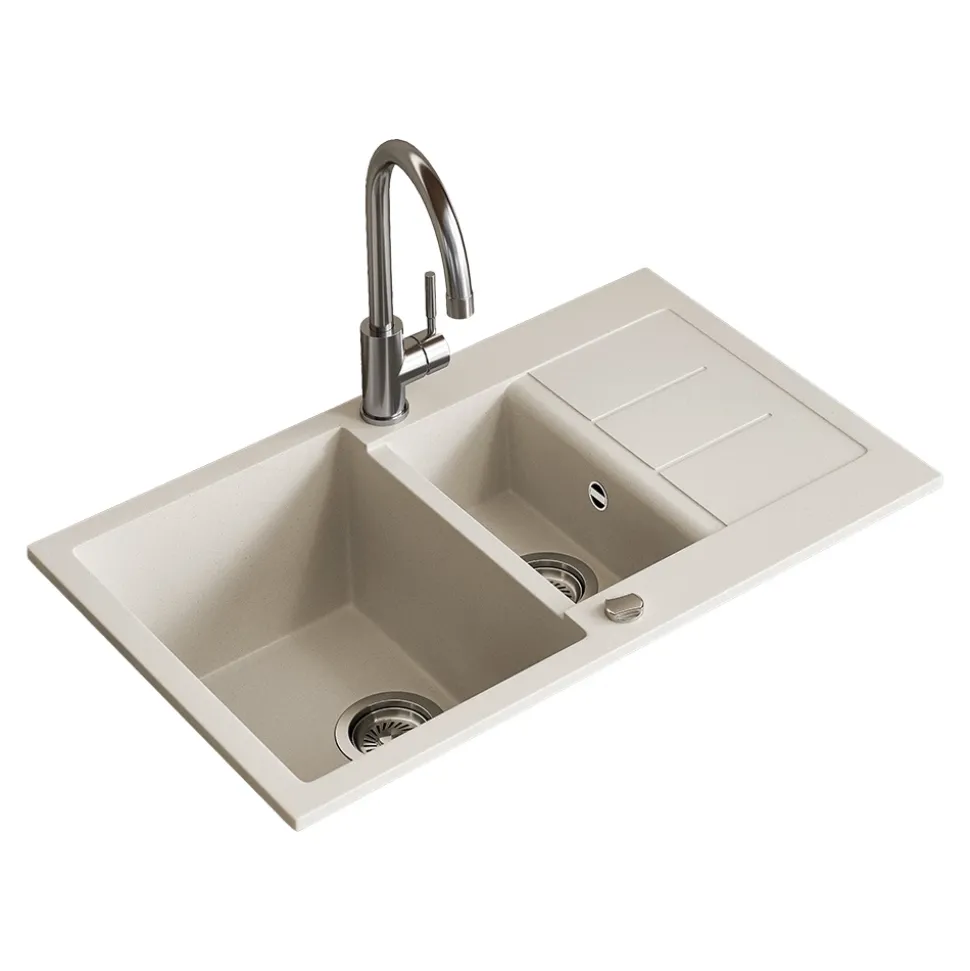 - Doppelbecken mit großem Hauptbecken, kleinem Zusatzbecken und Abtropffläche – Spülen, Abgießen und Abstellen gleichzeitig. Passt in gängige Unterschränke und ist leicht zu montieren.