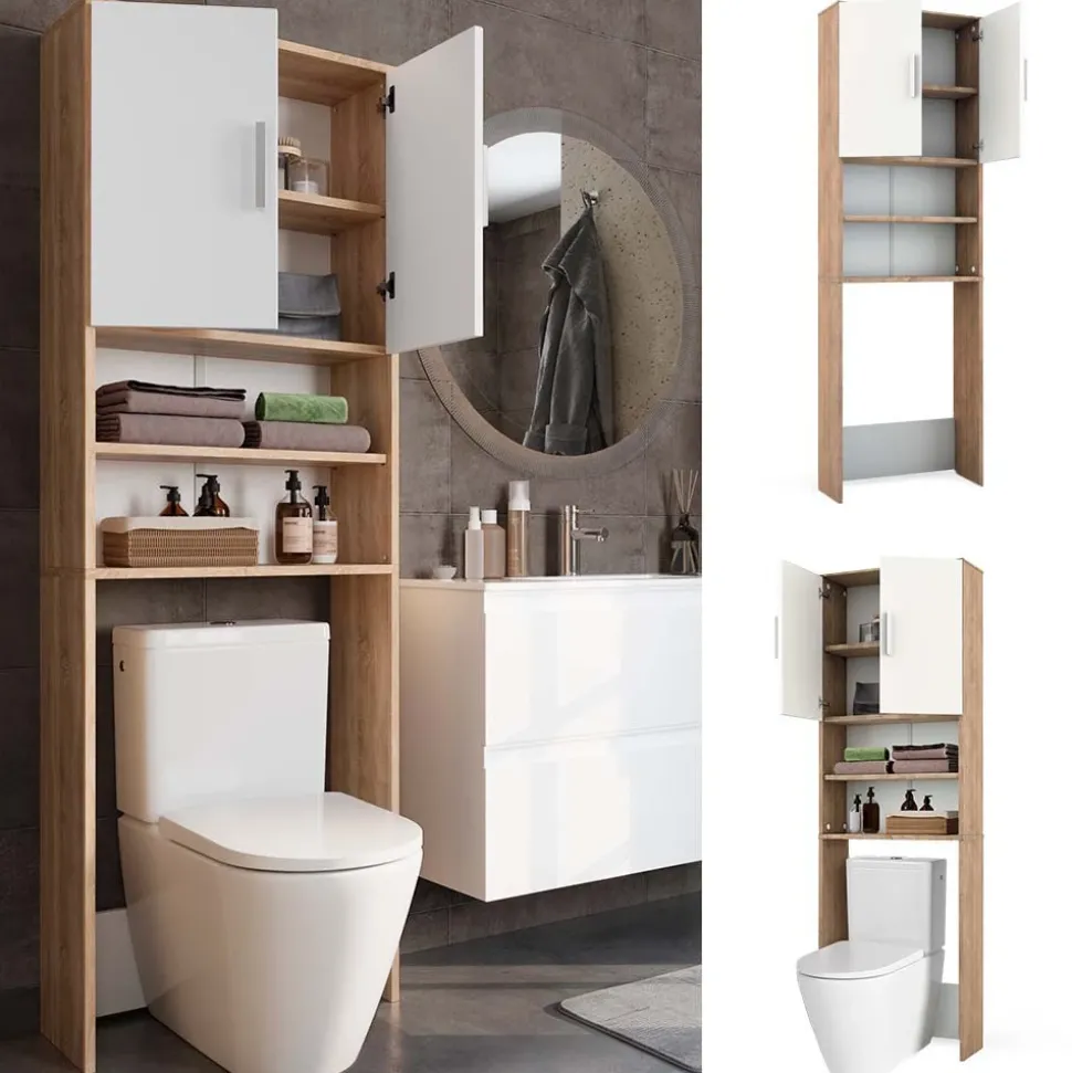 - MAßE: Toilettenregal mit 2 Türen – Tiefe: 26 cm, Breite: 64 cm, Höhe: 190 cm. Alle detaillierten Größen sind auf den Fotos angegeben.