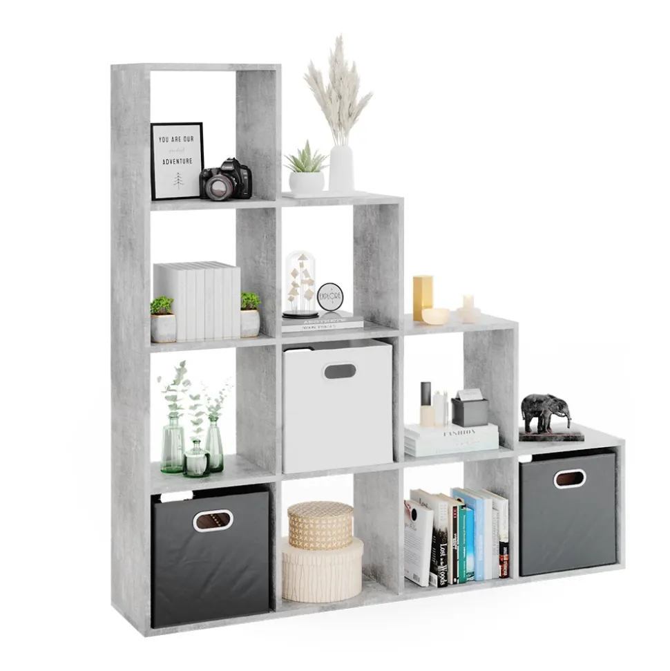 - Das Bücherregal steht aufrecht und bietet Platz für bis zu 10 offene Ablageflächen in kastenförmigen Regalen, die in einer leiterförmigen Anordnung angeordnet sind.