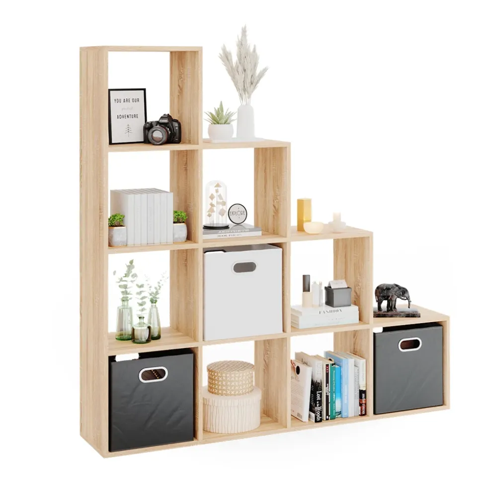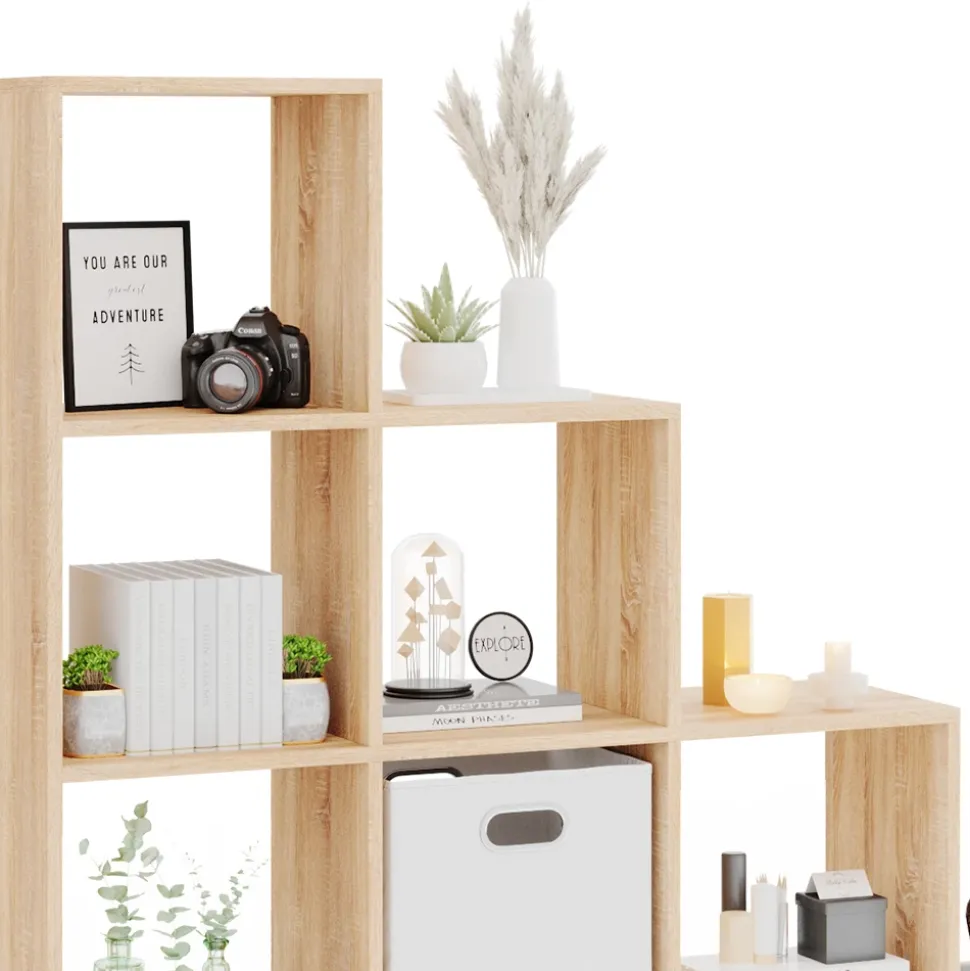 - Der Raumtrenner steht aufrecht und bietet Platz für bis zu 10 offene Ablageflächen in kastenförmigen Regalen, die in einer leiterförmigen Anordnung angeordnet sind.