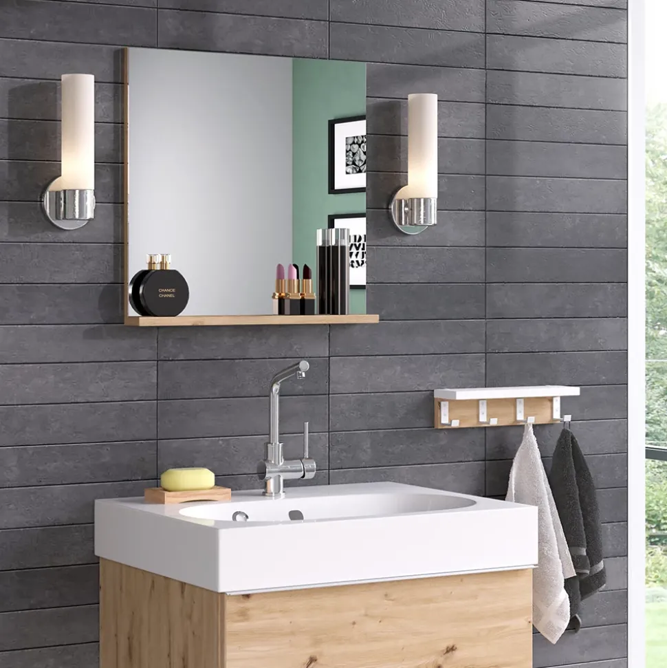- Entdecken Sie das Vicco Badezimmerset Henri in Weiß-Artisan – bestehend aus einem Wandspiegel und einem Wandregal mit Haken für eine effektive Badezimmer-Organisation.
